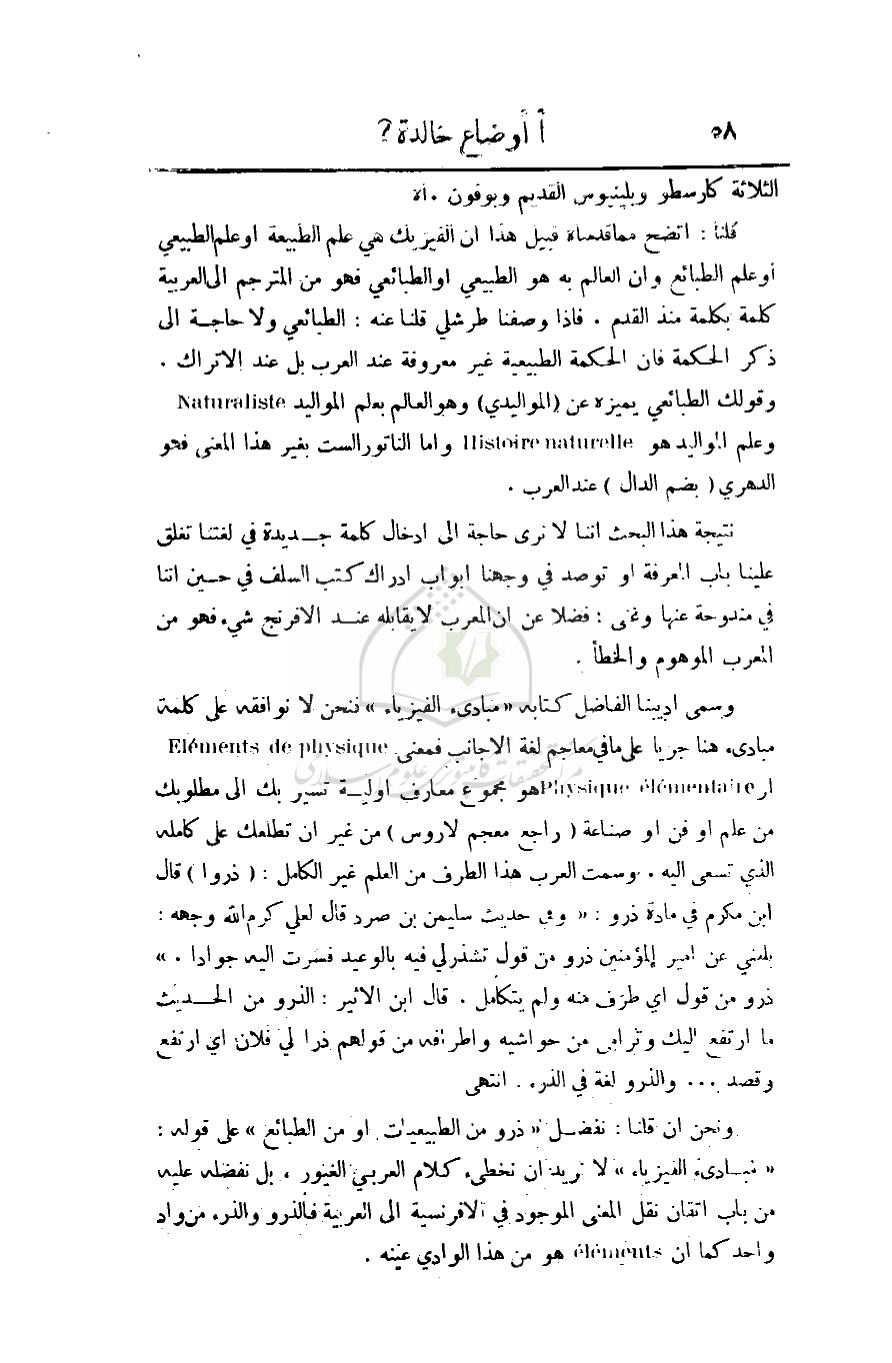 ونحن إن قلنا: نفضل (ذرو من الطبيعيات أو من الطبائع) على قوله: (مبادئ الفيزياء) لا نريد أن نخطئ كلام العربي الغيور. بل نفضله عليه من باب إتقان نقل المعنى الموجود في الافرنسية إلى العربية فالذرو والذرء من واد واحد كما أن هو من هذا الوادي عينه.