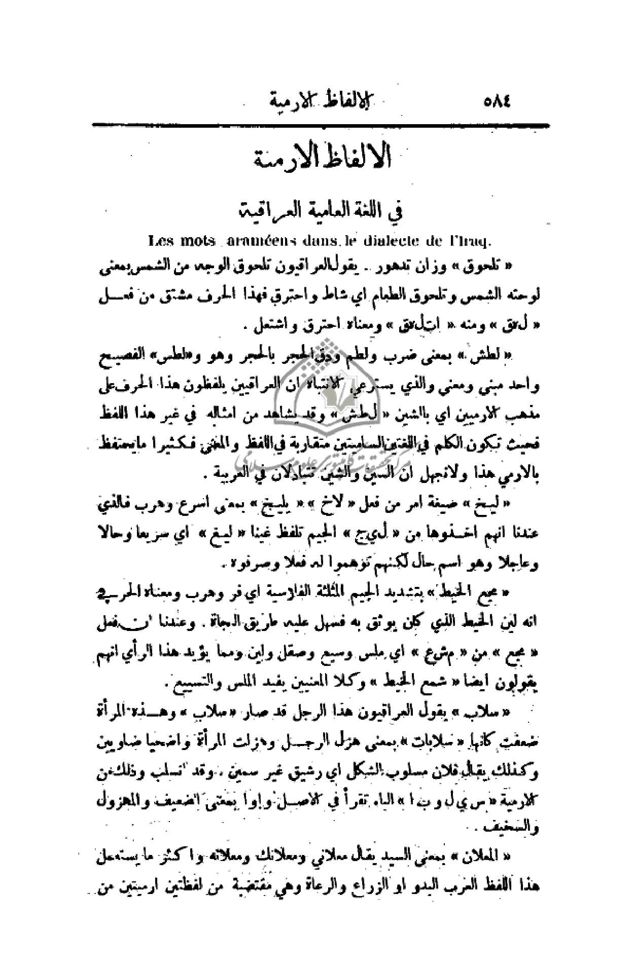 (لطش) بمعنى ضرب ولطم ودق الحجر بالحجر وهو و (لطس) الفصيح واحد مبنى ومعنى والذي يسترعي الانتباه أن العراقيين يلفظون هذا الحرف على مذهب الارميين أي بالشين (ل ط ش) وقد يشاهد من أمثاله في غير هذا اللفظ فحيث تكون الكلم في اللغتين الساميتين متقاربة في اللفظ والمعنى فكثيرا ما يحتفظ بالارمي هذا ولا نجهل أن السين والشين تتبادلان في العربية.