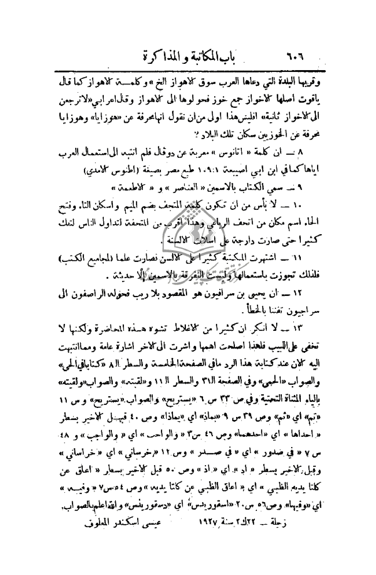 13 - لا أنكر أن كثيرا من الأغلاط تشوه هذه المحاضرة ولكنها لا تخفى على اللبيب فلهذا أصلحت أهمها وأشرت إلى الآخر إشارة عامة ومما انتبهت إليه الآن عند كتابة هذا الرد ما في الصفحة الخامسة والسطر ال 8 (كتابا في الحي) والصواب (الحمى) وفي الصفحة ال 31 والسطر ال 11 و (لقبته) والصواب (ولقيته) بالياء المثناة التحتية وفي ص33 س6 (يستربح) والصواب (يستريح) وس11 (تم) أي (ثم) وص39 س9 (بماذ) أي (بماذا) وص40 قبل الأخير بسطر (إحداها) أي (أحدهما) وص46 س3 (والواحب) أي (والواجب) و48 س7 (في صدور) أي (في صدر) وس11 (خرساني) أي (خراساني) وقبل الأخير بسطر (اد) أي (إذ) وص50 قبل الأخير بسطر (أعاق عن كلتا يديه الظبي) أي (أعاق الظبي عن كلتا يديه) وص54 س7 (وفيه) أي (وفيها) وص56 س20 (اسقورينس) أي (دسقورينس) والله اعلم بالصواب.