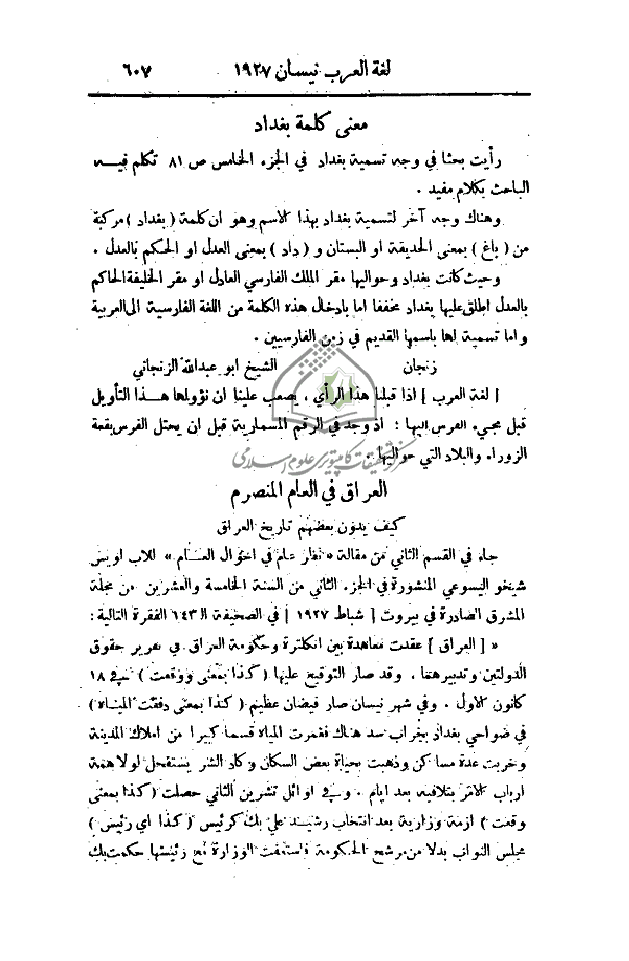(لغة العرب) إذا قبلنا هذا الرأي. يصعب علينا أن نؤولها هذا التأويل قبل مجيء الفرس إليها؛ إذ وجد في الرقم المسمارية قبل أن يحتل الفرس بقعة الزوراء والبلاد التي حواليها.