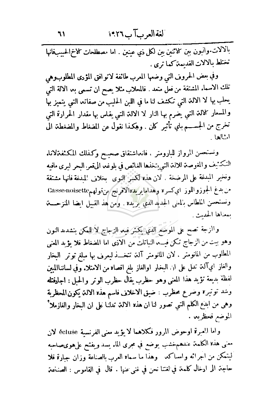ونستحسن المرواز للبارومتر. فإنه اشتقاق صحيح وكذلك المكثفة لإناء التكثيف والمغوصة للآلة التي يتخذها الغائص في بلوغه إلى قعر البحر ليرى ما فيه ونخير المبدغة على المرضخة. لأن هذه لكسر النوى بخلاف المبدغة فإنها مشتقة من بدغ الجوز واللوز أي كسره وهذا ما يريده الإفرنج من قولهم - ونستحسن الملطاس بالمعنى الجديد الذي يريده ومن هذا القبيل أيضاً المنزحة بمعناها الحديث.