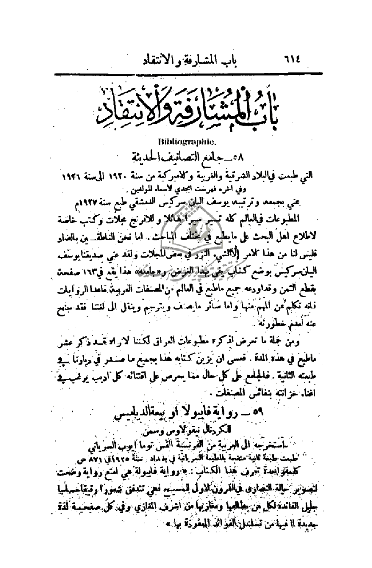 المطبوعات في العالم كله تسير سيرا هائلا وللإفرنج مجلات وكتب خاصة لإطلاع أهل البحث على ما يطبع في مختلف المباحث. أما نحن الناطقين بالضاد فليس لنا من هذا الأمر إلاَّ الشيء النزر في بعض المجلات ولقد عني صديقنا يوسف آليان سركيس بوضع كتاب يفي بهذا الغرض و (جامعه) هذا يقع في 163 صفحة بقطع الثمن وقد أودعه جميع ما طبع في العالم من المصنفات العربية ما عدا الروايات فأنه تكلم عن المهم منها وأما سائر ما يصنف ويترجم وينقل إلى لغتنا فقد جنح عنه لعدم خطورته.