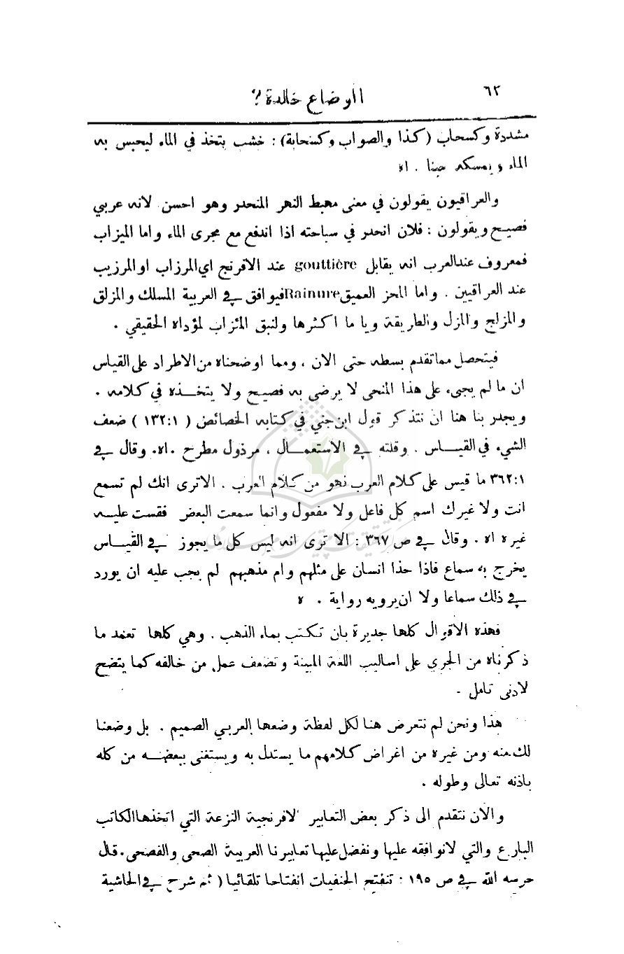 يجيء على هذا المنحى لا يرضى به فصيح ولا يتخذه في كلامه. ويجدر بنا هنا أن نتذكر قول ابن جني في كتابه الخصائص (132: 1) ضعف الشيء في القياس. وقلته في الاستعمال. مرذول مطرح. أهـ وقال في 362: 1 ما قيس على كلام العرب فهو من كلام العرب. ألا ترى انك لم تسمع أنت ولا غيرك اسم كل فاعل ولا مفعول وإنما سمعت البعض فقست عليه غيره أهـ. وقال في ص367: ألا ترى أنه ليس كل ما يجوز في القياس يخرج به سماع فإذا حذا إنسان على مثلهم وآم مذهبهم لم يجب عليه أن يورد في ذلك سماعا ولا أن يرويه رواية. أهـ