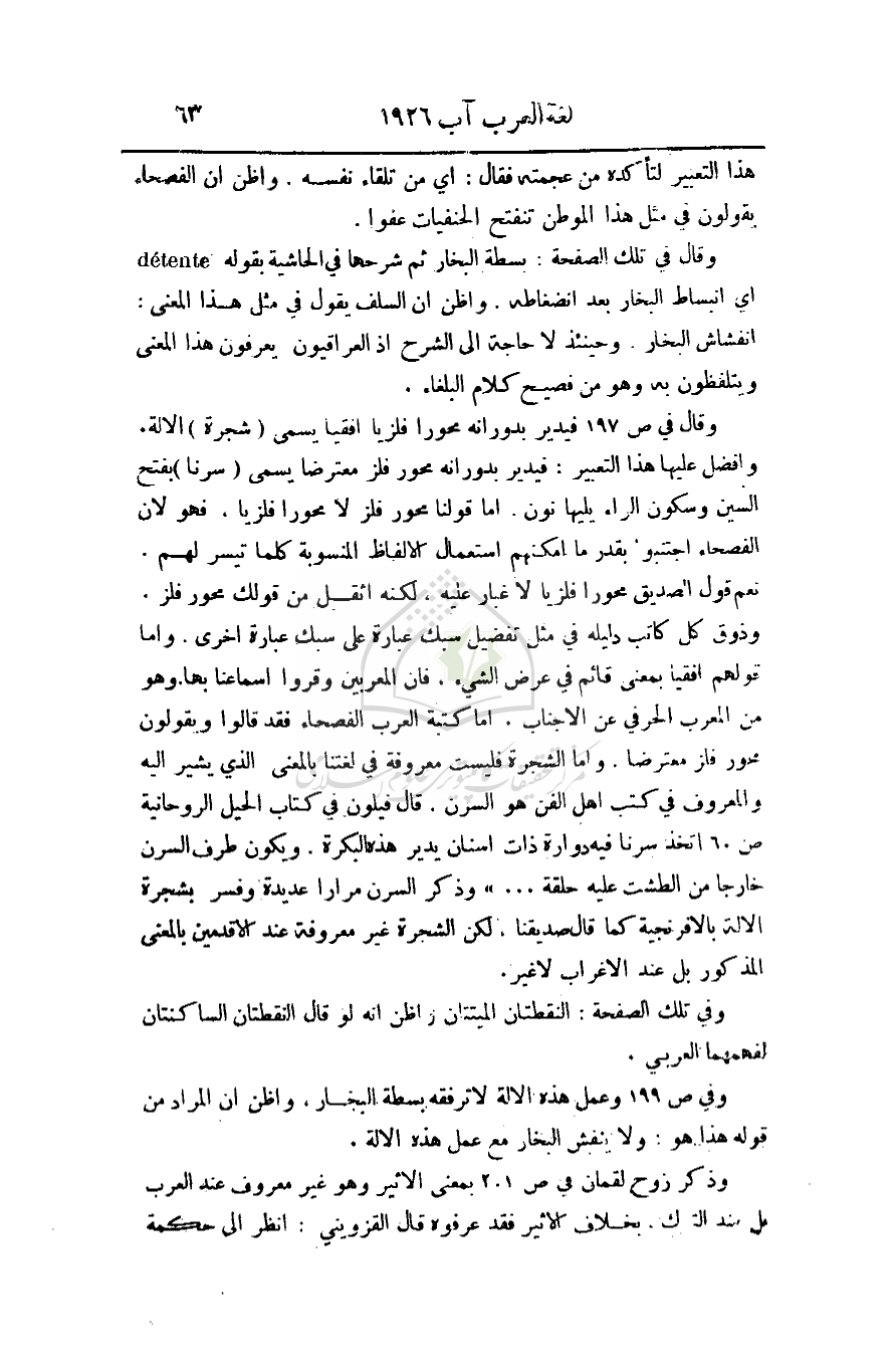 بها. وهو من المعرب الحرفي عن الأجناب. أما كتبة العرب الفصحاء فقد قالوا ويقولون محور فلز معترضا. وأما الشجرة فليست معروفة في لغتنا بالمعنى الذي يشير إليه والمعروف في كتب أهل الفن هو السرن. قال فينلون في كتاب الحيل الروحانية ص60 اتخذ سرنا فيه دوارة ذات أسنان يدير هذه البكرة. ويكون طرف السرن خارجا من الطشت عليه حلقة. . .) وذكر السرن مراراً عديدة وفسر بشجرة الآلة بالإفرنجية كما قال صديقنا، لكن الشجرة غير معروفة عند الأقدمين بالمعنى المذكور بل عند الأغراب لا غير.