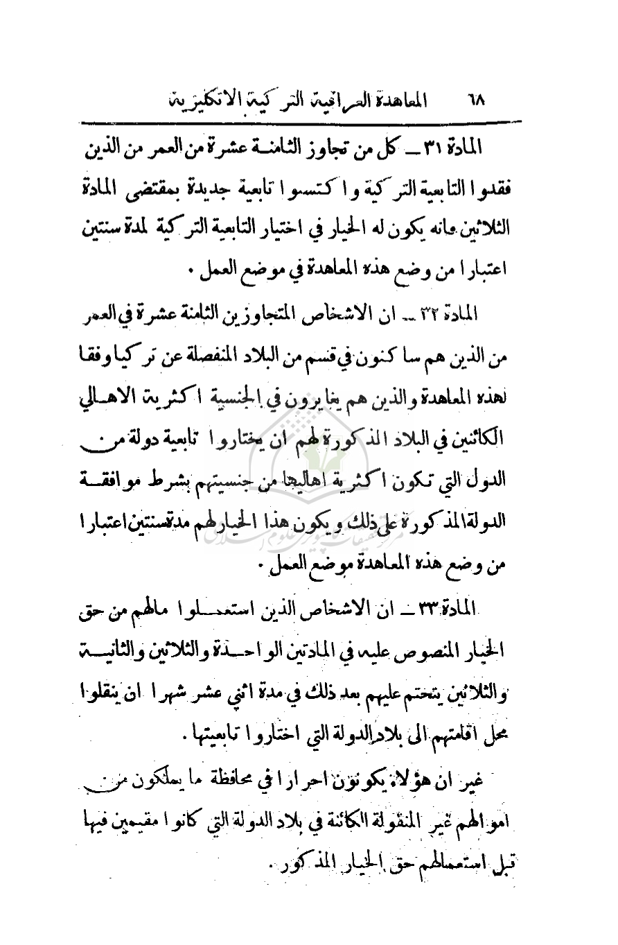 المادة 32 - أن الأشخاص المتجاوزين الثامنة عشرة في العمر من الذين هم ساكنون في قسم من البلاد المنفصلة عن تركيا وفقا لهذه المعاهدة والذين هم يغايرون في الجنسية أكثرية الأهالي الكائنين في البلاد المذكورة لهم أن يختاروا تابعية دولة من الدول التي تكون أكثرية أهاليها من جنسيتهم بشرط موافقة الدولة المذكورة على ذلك ويكون هذا الخيار لهم مدة سنتين اعتبارا من وضع هذه المعاهدة موضع العمل.