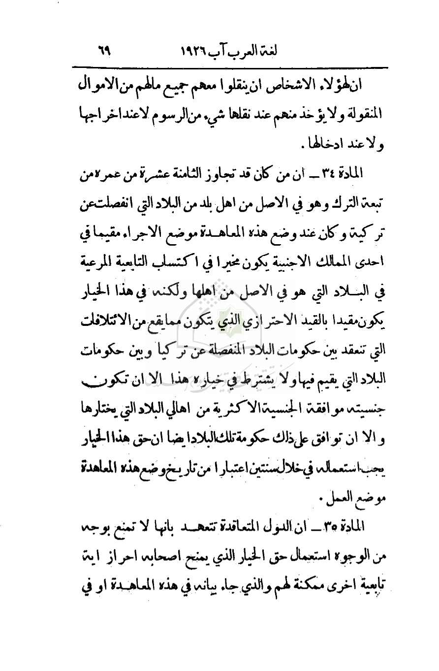 من أهل بلد من البلاد التي انفصلت عن تركية وكان عند وضع هذه المعاهدة موضع الإجراء مقيما في إحدى الممالك الأجنبية يكون مخيرا في اكتساب التابعية المرعية في البلاد التي هو في الأصل من أهلها ولكنه في هذا الخيار يكون مقيدا بالقيد الاحترازي الذي يتكون مما يقع من الائتلافات التي تنعقد بين حكومات البلاد المنفصلة عن تركيا وبين حكومات البلاد التي يقيم فيها ولا يشترط في خياره هذا إلا أن تكون جنسيته موافقة لجنسية الأكثرية من أهالي البلاد التي يختارها وإلاَّ أن توافق على ذلك حكومة تلك البلاد أيضاً أن حق هذا الخيار يجب استعماله في خلال سنتين اعتبارا من تاريخ وضع هذه المعاهدة موضع العمل.