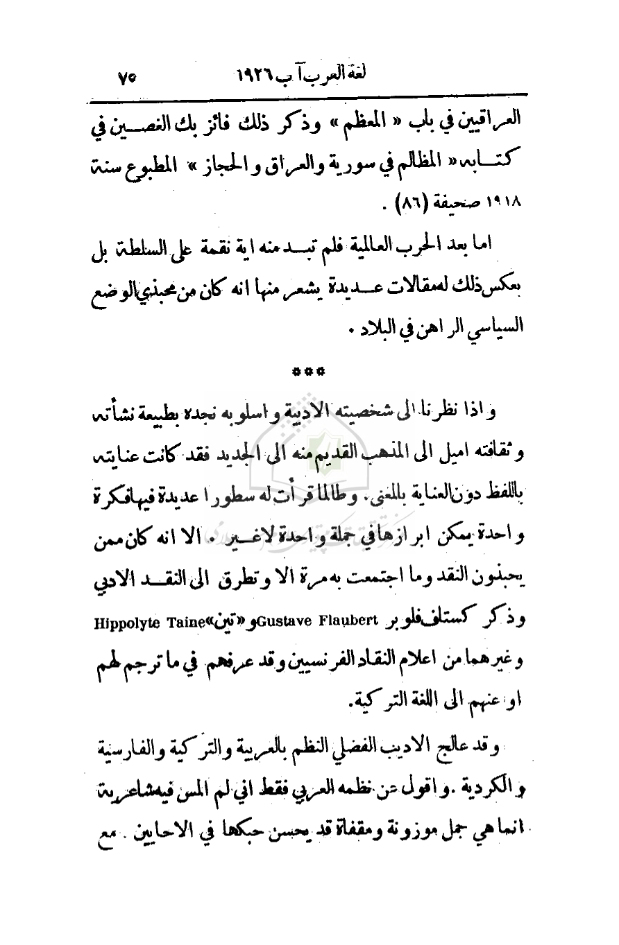 وإذا نظرنا إلى شخصيته الأدبية وأسلوبه نجده بطبيعة نشأته وثقافته أميل إلى المذهب القديم منه إلى الجديد فقد كانت عنايته باللفظ دون العناية بالمعنى. وطالما قرأت له سطورا عديدة فيها فكرة واحدة يمكن إبرازها في جملة واحدة لا غير. إلا انه كان ممن يحبذون النقد وما اجتمعت به مرة إلا وتطرق إلى النقد الأدبي وذكر كستاف فلوبر و (تين) وغيرهما من أعلام النقاد الفرنسيين وقد عرفهم في ما ترجم لهم أو عنهم إلى اللغة التركية.