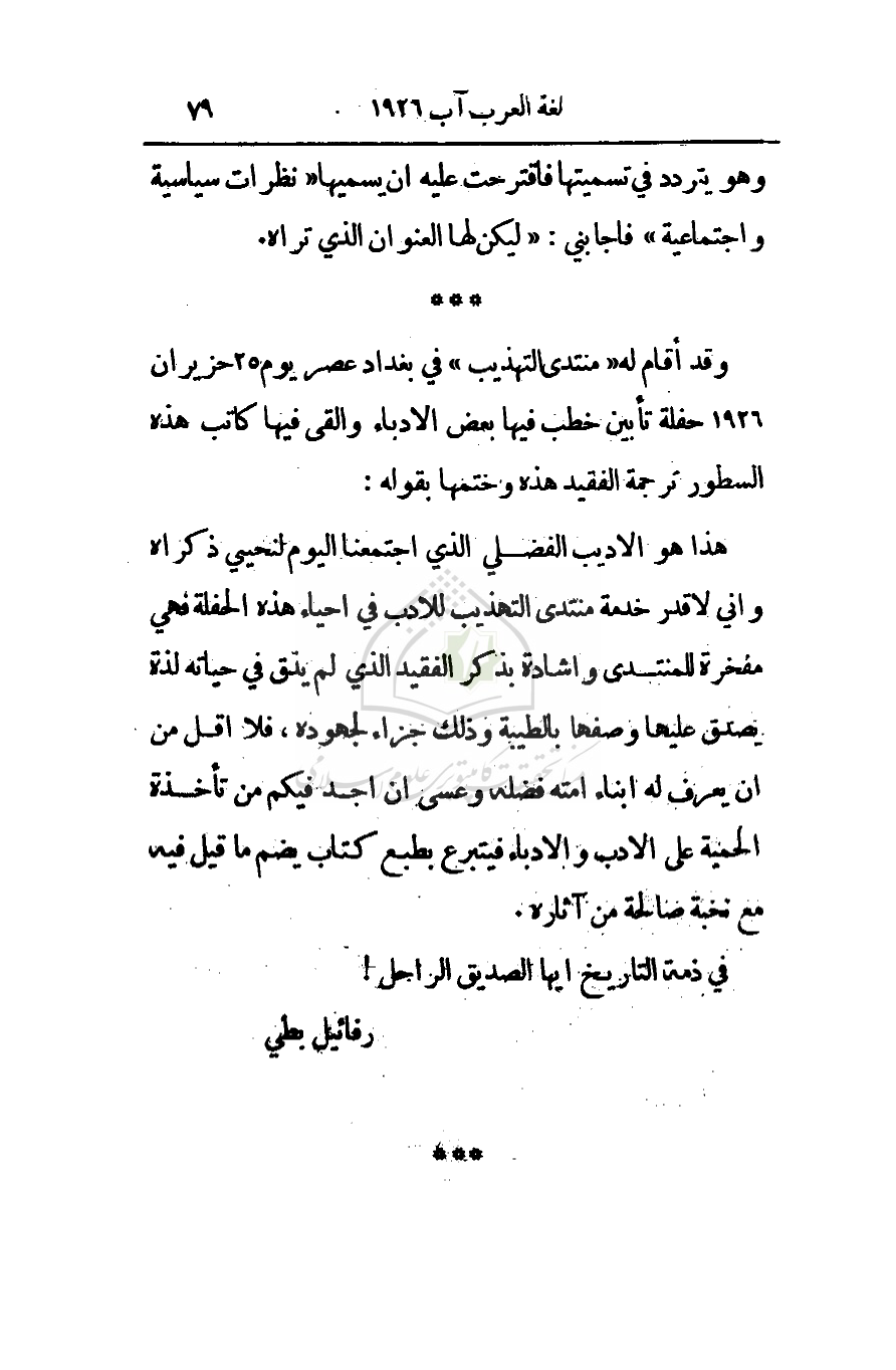 وقد أقام له (منتدى التهذيب) في بغداد عصر يوم 25 حزيران 1926 حفلة تأبين خطب فيها بعض الأدباء وألقى فيها كاتب هذه السطور ترجمة الفقيد هذه وختمها بقوله: