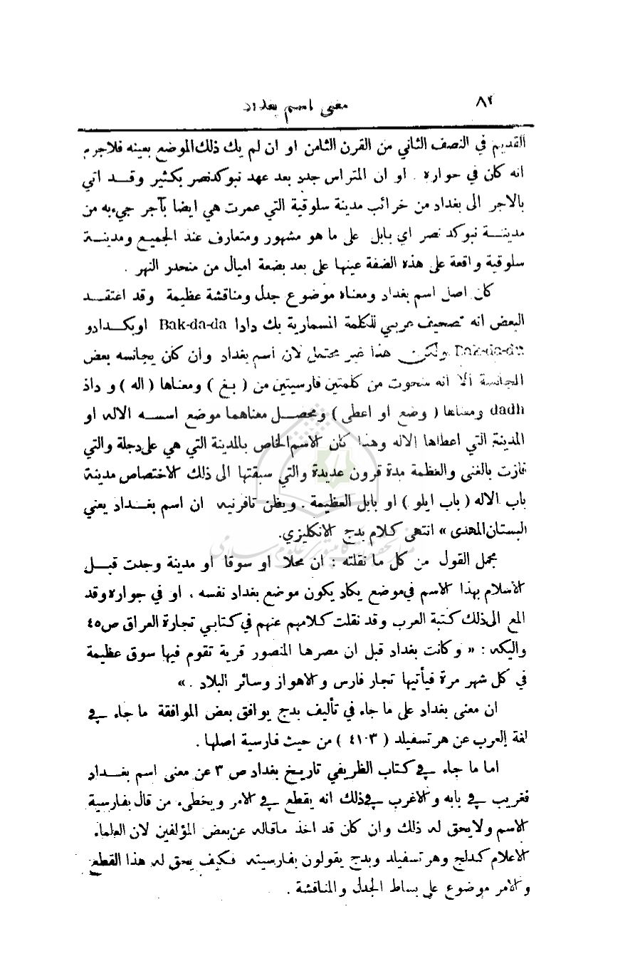 أن معنى بغداد على ما جاء في تأليف بدج يوافق بعض الموافقة ما جاء في لغة العرب عن هرتسفيلد (41: 3) من فارسية أصلها.