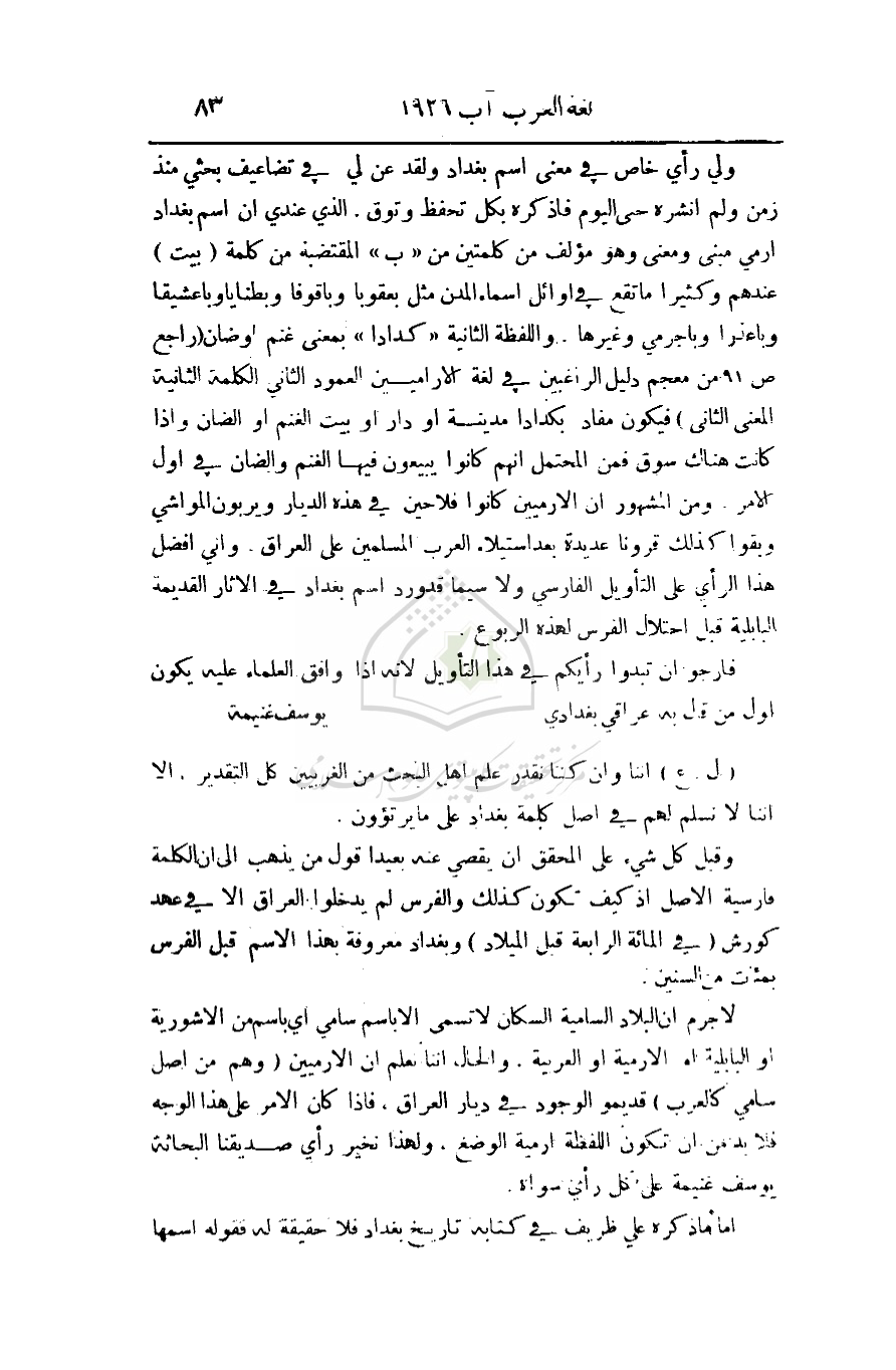 لا جرم أن البلاد السامية السكان لا تسمى إلا باسم سامي أي باسم من الآشورية أو البابلية أو الارمية أو العربية. والحال أننا نعلم أن الارميين (وهم من أصل سامي كالعرب) قديمو الوجود في ديار العراق. فإذا كان الأمر على هذا الوجه فلابد من أن تكون اللفظة ارمية الوضع. ولهذا نخير رأي صديقنا البحاثة يوسف غنيمة على كل رأي سواه.