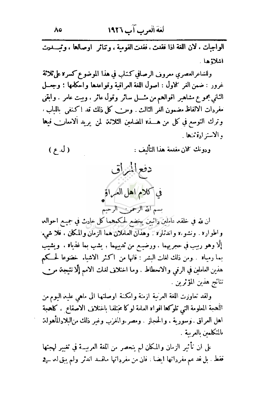 إن لله في خلقه عاملين دائبين يخضع لحكمهما كل حادث في جميع أحواله وأطواره، ونشوءه واندثاره. وهذان العاملان هما الزمان والمكان، فلا شيء إلا وهو ربيب في حجريهما. ورضيع من ثدييهما، يشب بما غذياه، ويشيب بما رمياه، ومن ذلك لغات البشر: فإنها من اكثر الأشياء خضوعا لحكم هذين العاملين في الرقي والانحطاط، وما اختلاف لغات الأمم إلا نتيجة من نتائج هذين المؤثرين.