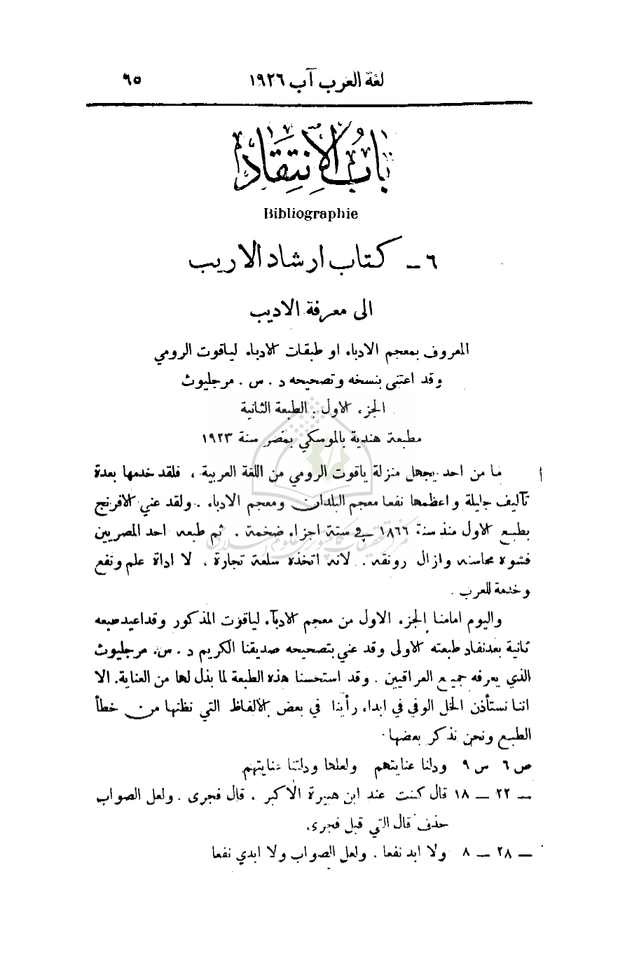 واليوم أمامنا الجزء الأول من معجم الأدباء لياقوت المذكور وقد أعيد طبعه ثانية بعد نفاد طبعته الأولى وقد عني بتصحيحه صديقنا الكريم د. س. مرجليوث الذي يعرفه جميع العراقيين. وقد استحسنا هذه الطبعة لما بذل لها من العناية. إلا أننا نستأذن الخل الوفي في إبداء رأينا في بعض الألفاظ التي نظنها من خطأ الطبع ونحن نذكر بعضها: