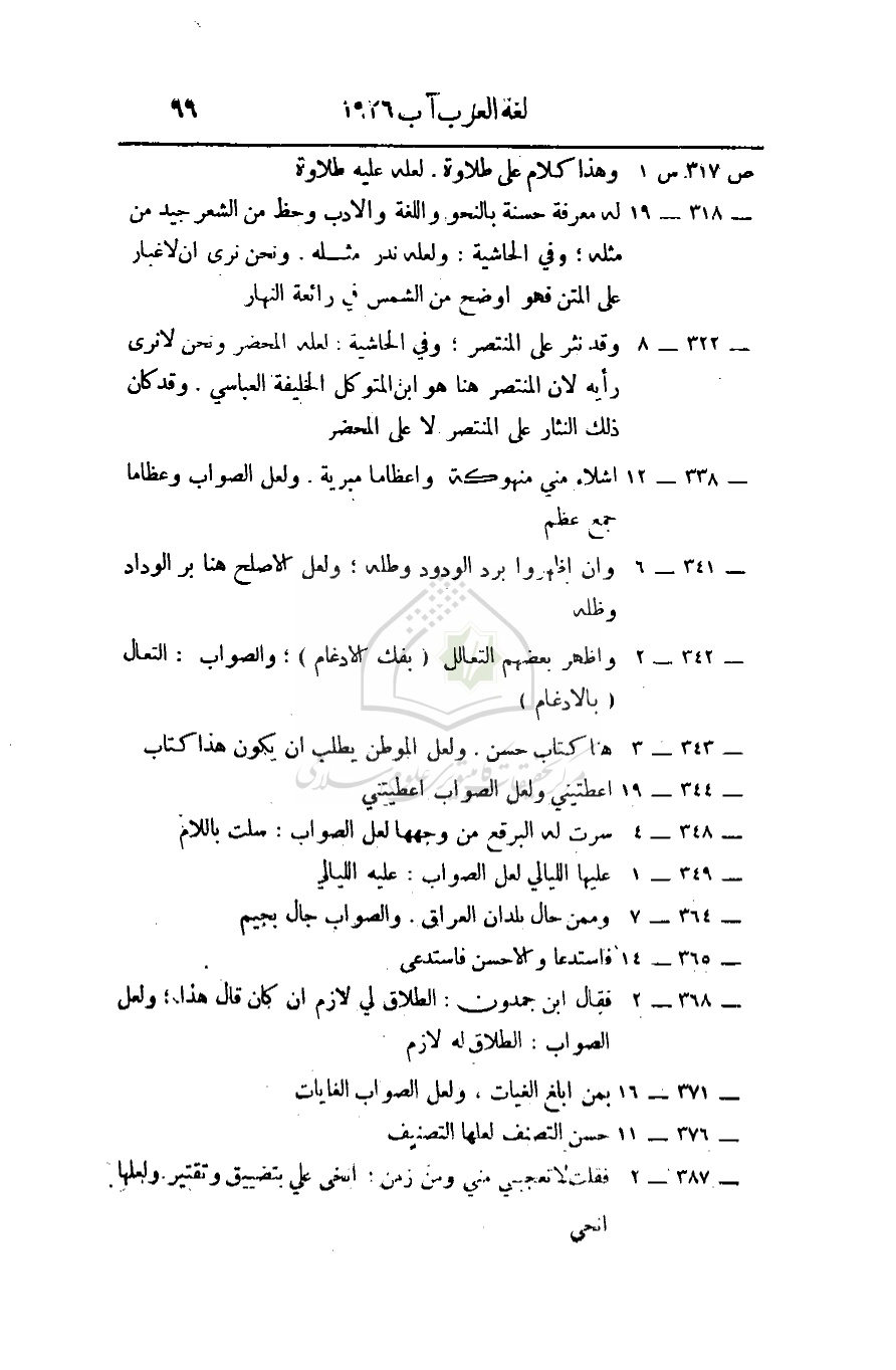 ص318 س19 له معرفة حسنة بالنحو واللغة والأدب وحظ من الشعر جيد من مثله؛ وفي الحاشية: ولعله ندر مثله. ونحن نرى أن لا غبار على المتن فهو أوضح من الشمس في رائعة النهار