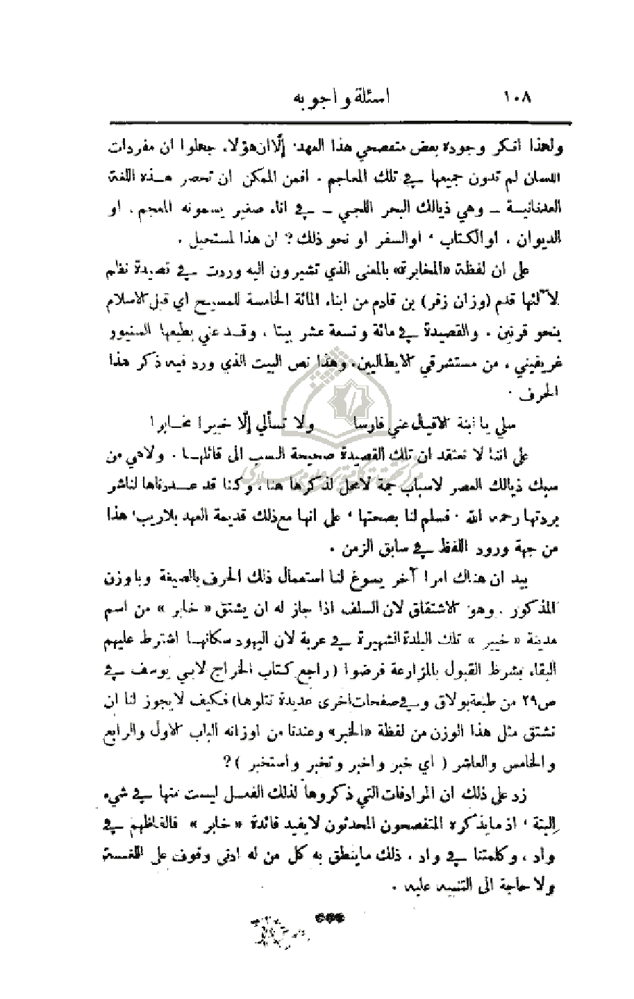 في عربة لأن اليهود سكانها أشترط عليهم البقاء بشرط القبول بالمزارعة فرضوا (راجع كتاب الخراج لأبي يوسف في ص29 من طبعة بولاق وفي صفحات أخرى عديدة تتلوها) فكيف لا يجوز لنا أن نشتق مثل هذا الوزن من لفظة (الخبر) وعندنا من أوزانه الباب الأول والرابع والخامس والعاشر (أي خبر وأخبر وتخبر وأستخبر)؟