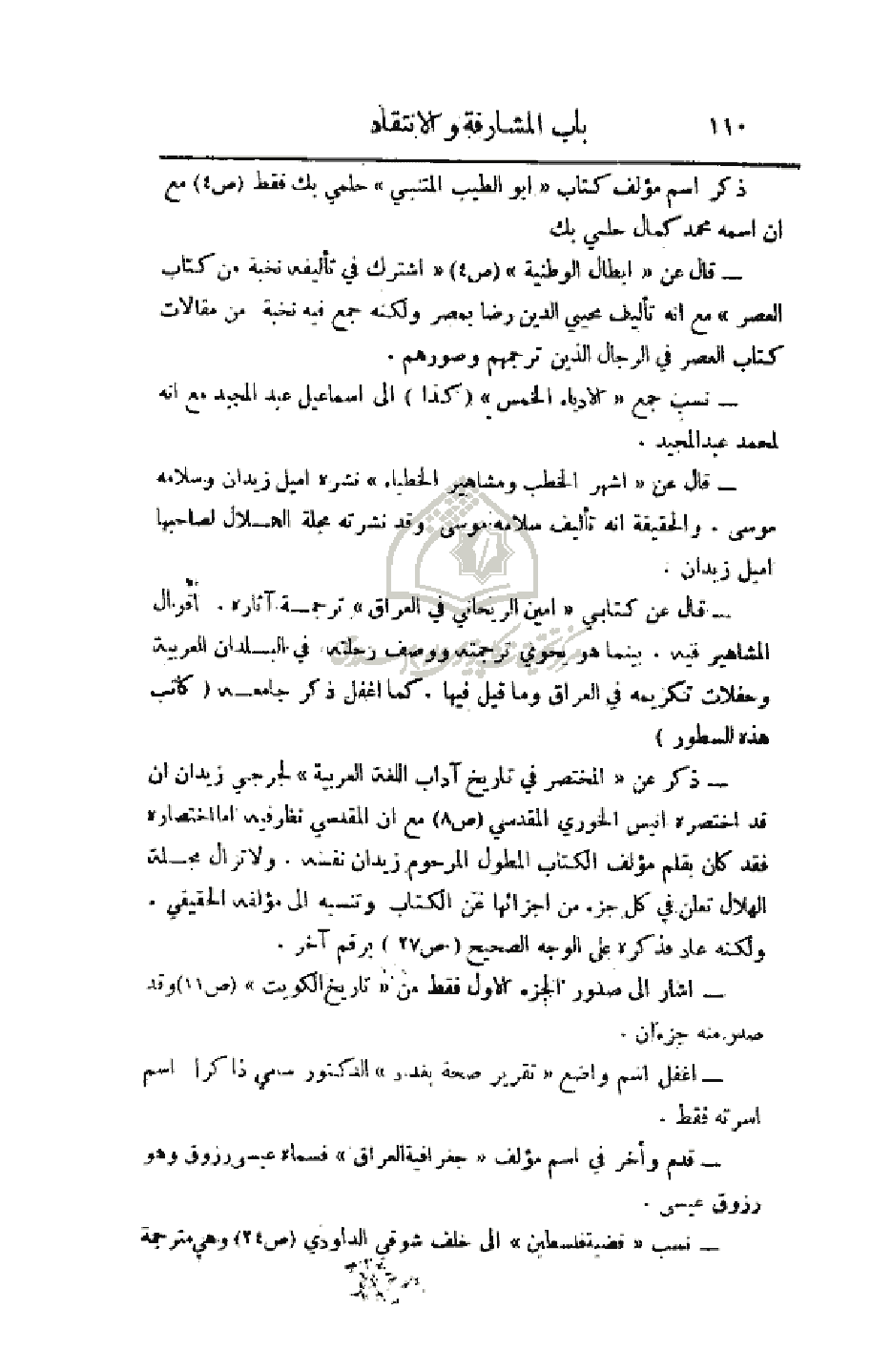 - ذكر عن (المختصر في تاريخ آداب اللغة العربية) لجرجي زيدان أن قد اختصره أنيس الخوري المقدسي (ص8) مع أن المقدسي نظر فيه أما اختصاره فقد كان بقلم مؤلف الكتاب المطول المرحوم زيدان نفسه. ولا تزال مجلة الهلال تعلن في كل جزء من أجزائها عن الكتاب وتنسبه إلى مؤلفه الحقيقي. ولكنه عاد فذكره على الوجه الصحيح (ص27) برقم آخر.