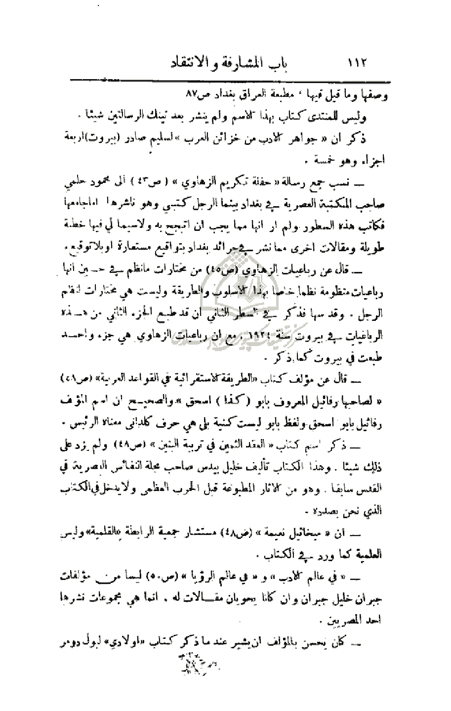 - نسب جمع رسالة (حفلة تكريم الزهاوي) (ص43) إلى محمود حلمي صاحب المكتبة العصرية في بغداد بينما الرجل كتبي وهو ناشرها أما جامعها فكاتب هذه السطور ولم أر أنها مما يجب أن أتبجح به ولا سيما لي فيها خطة طويلة ومقالات أخرى مما نشر في جرائد بغداد بتواقيع مستعارة أو بلا توقيع.