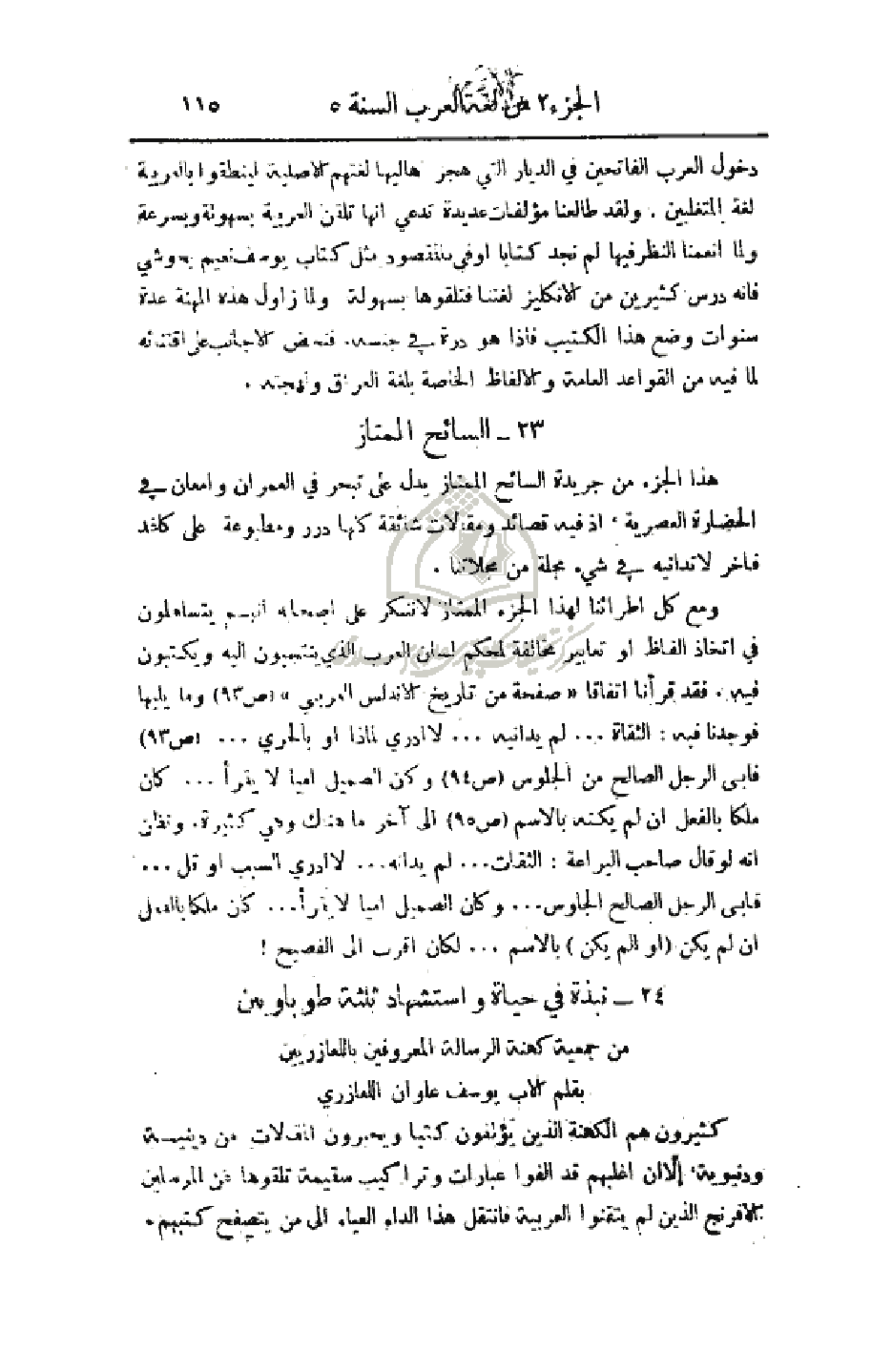 ومع كل إطرائنا لهذا الجزء الممتاز لا ننكر على أصحابه أنهم يتساهلون في اتخاذ ألفاظ أو تعابير مخالفة لمحكم لسان العرب الذي ينتسبون إليه ويكتبون فيه. فقد قرأنا اتفاقاً (صفحة من تاريخ الأندلس العربي) (ص93) وما يليها فوجدنا فيه: الثقاة. . . لم يدانيه. . . لا أدري لماذا أو بالحري. . . (ص93) فأبى الرجل الصالح من الجلوس (ص94) وكان الصميل أميا لا يقرأ. . . كان ملكاً بالفعل إن لم يكن بالاسم (ص95) إلى آخر ما هناك وهي كثيرة. ونظن أنه لو قال صاحب البراعة: الثقات. . . لم يدانه. . . . لا أدري السبب أو قل. . . فأبى الرجل الصالح الجلوس. . . وكان الصميل أميا لا يقرأ. . . كان ملكاً بالفعل إن لم يكن (أو ألم يكن) بالاسم. . . لكان أقرب إلى الفصيح!