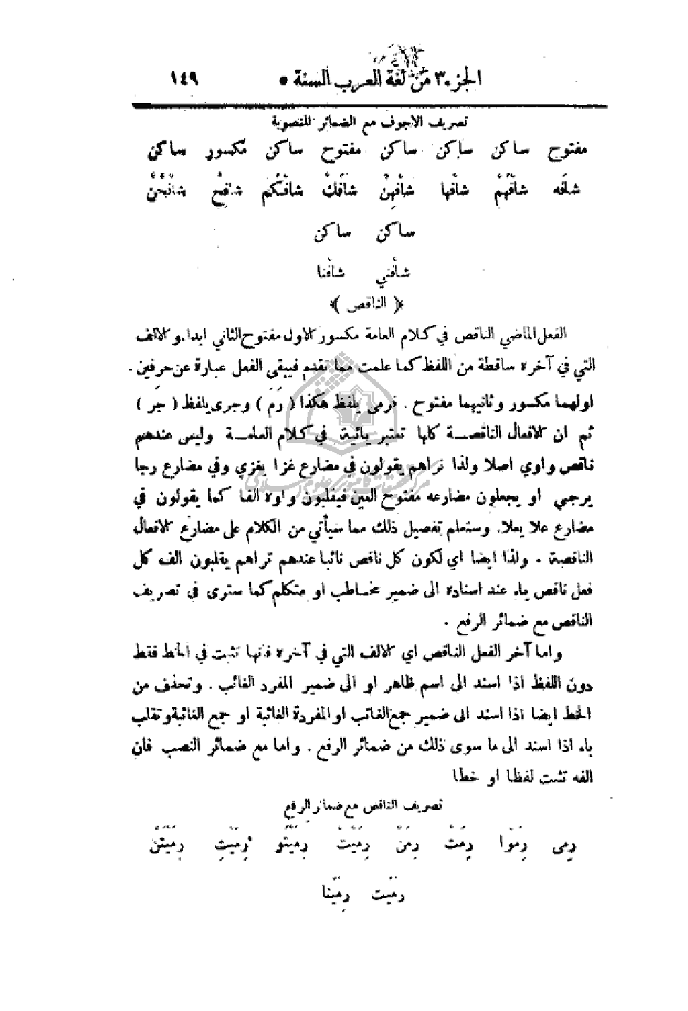 الفعل الماضي الناقص في كلام العامة مكسور الأول مفتوح الثاني أبدا. والألف التي في آخره ساقطة من اللفظ كما علمت مما تقدم فيبقى الفعل عبارة عن حرفين أولهما مكسور وثانيهما مفتوح. فرمى يلفظ هكذا (رَمَ) وجرى يلفظ (جَرَ) ثم أن الأفعال الناقصة كلها تعتبر يائية في كلام العامة وليس عندهم ناقص واوي أصلا ولذا نراهم يقولون في مضارع غزا يغزي وفي مضارع رجا يرجي أو يجعلون مضارعه مفتوح العين فيقلبون واوه ألفا كما يقولون في مضارع علا يعلا. وستعلم تفصيل ذلك مما سيأتي من الكلام على مضارع الأفعال الناقصة. ولذا أيضا أي لكون كل فعل ناقص نائبا عندهم تراهم يقلبون ألف كل فعل ناقص ياء عند إسناده إلى ضمير مخاطب أو متكلم كما سترى في تصريف الناقص مع ضمائر الرفع.