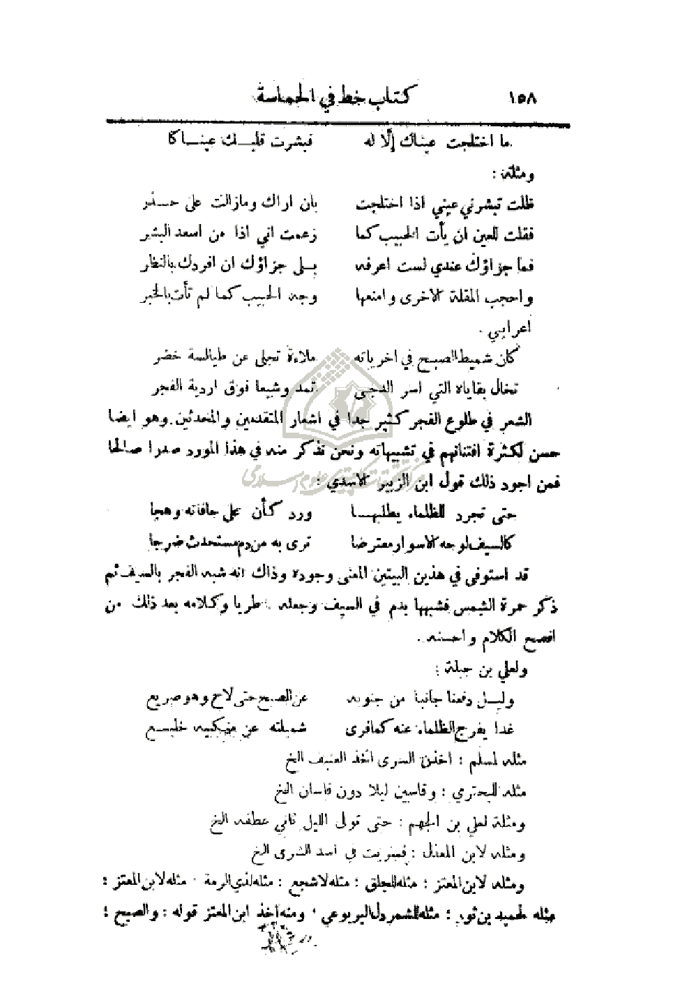 ومثله لابن المعتز؛ مثله للجلق: مثله لأشجع: مثله لذي الرمة، مثله لابن المعتز: مثله لحميد بن ثور؛ مثله للشمردل اليربوعي، ومنه أخذ ابن المعتز قوله: والصبح؛