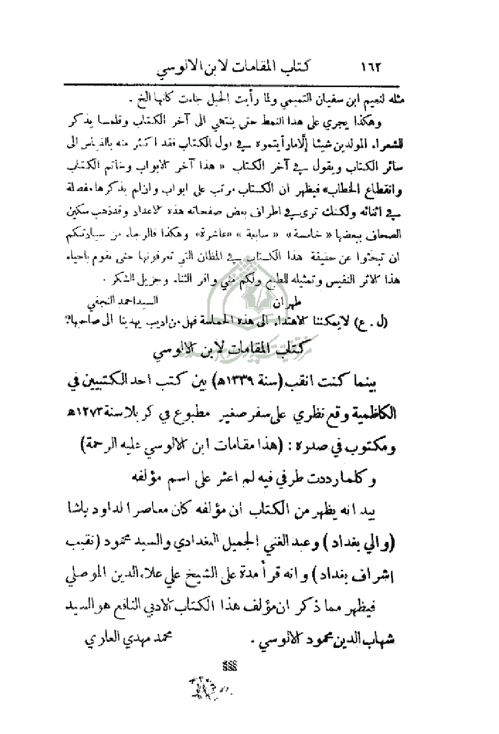 بينما كنت أنقب (سنة 1339هـ) بين كتب أحد الكتيبين في الكاظمية وقع نظري على سفر صغير مطبوع في كربلاء سنة 1273هـ ومكتوب في صدره: (هذا مقامات ابن الألوسي عليه الرحمة)