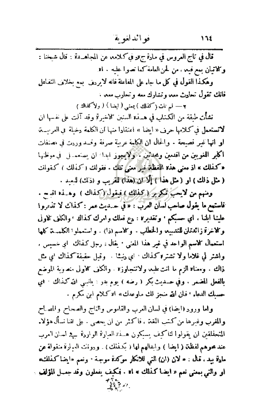 وأما ورود (أيضا) في لسان العرب والقاموس والتاج والصحاح والصباح والمغرب وغيرها من كتب اللغة، فأكثر من أن يحصى. على إنا نسأل هؤلاء المتحذلقين أن يقولوا لنا كيف يسكبون هذه العبارة الواردة في لسان العرب عند محوهم للفظة (أيضا) وبدلهم أنا (بكذلك). ودونك العبارة منقولة عن مادة بيد، قال: (لان (أن) التي للإنكار مؤكدة موجبة. ونعم (أيضا كذلك) أو والتي بمعنى نعم (أيضا كذلك) اه. فكيف يفعلون وقد جعل المؤلف