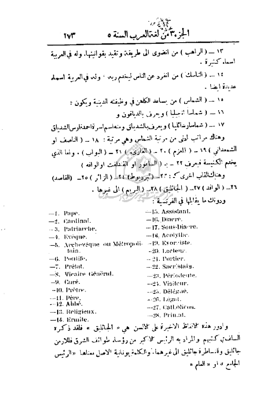 - 14. وأدور هذه الألفاظ الأخيرة على الألسن هي (الجائليق) فلقد ذكره السلف في كتبهم والمراد به الرئيس الأكبر من رؤساء طوائف الشرق فللأرمن جائليق وللساطرة جاثليق إلى غيرهما. والكلمة يونانية الأصل معناها (الرئيس الجامع) أو (العام).