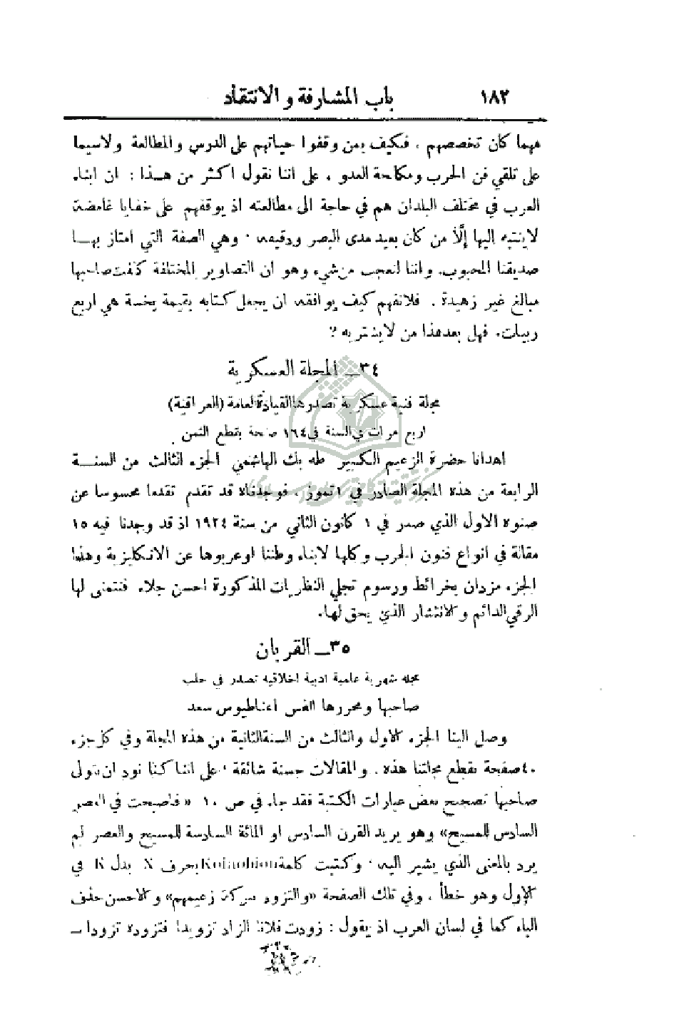 أهدانا حضرة الزعيم الكبير طه بك الهاشمي الجزء الثالث من السنة الرابعة من هذه المجلة الصادر في 1 تموز، فوجدناه قد تقدم تقدما محسوسا عن صنوه الأول الذي صدر في 1 كانون الثاني من سنة 1924 إذ قد وجدنا فيه 15 مقالة في أنواع فنون الحرب وكلها لأبناء