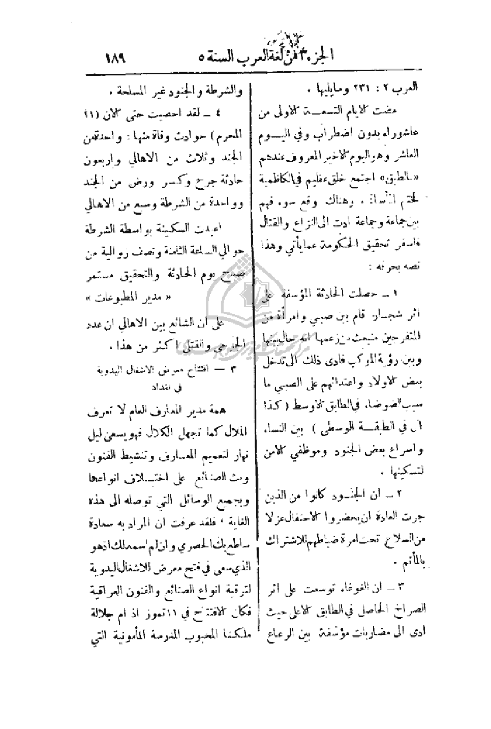 4 - لقد أحصيت حتى الآن (11 المحرم) حوادث وفاة منها: واحدة من الجند وثلاث من الأهالي وأربعون حادثة جرح وكسر ورض من الجند وواحدة من الشرطة وسبع من الأهالي