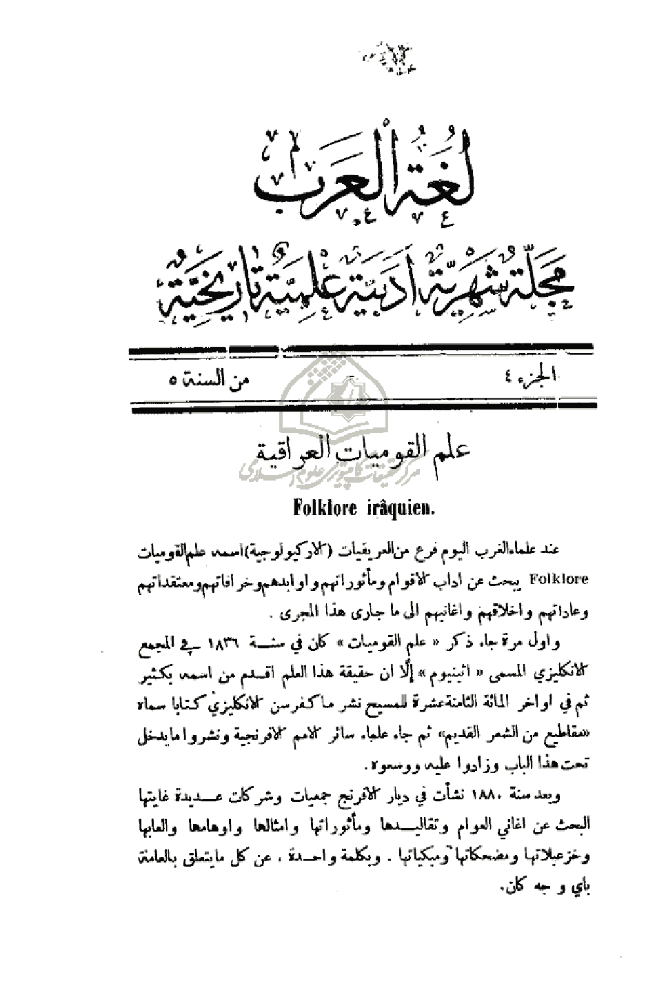 وبعد سنة 188. نشأت في ديار الإفرنج جمعيات وشركات عديدة غايتها البحث عن أغاني العوام وتقاليدها ومأثوراتها وأمثالها وأوهامها وألعابها وخزعبلاتها ومضحكاتها ومبكياتها. وبكلمة واحدة، عن كل ما يتعلق بالعامة بأي وجه كان.
