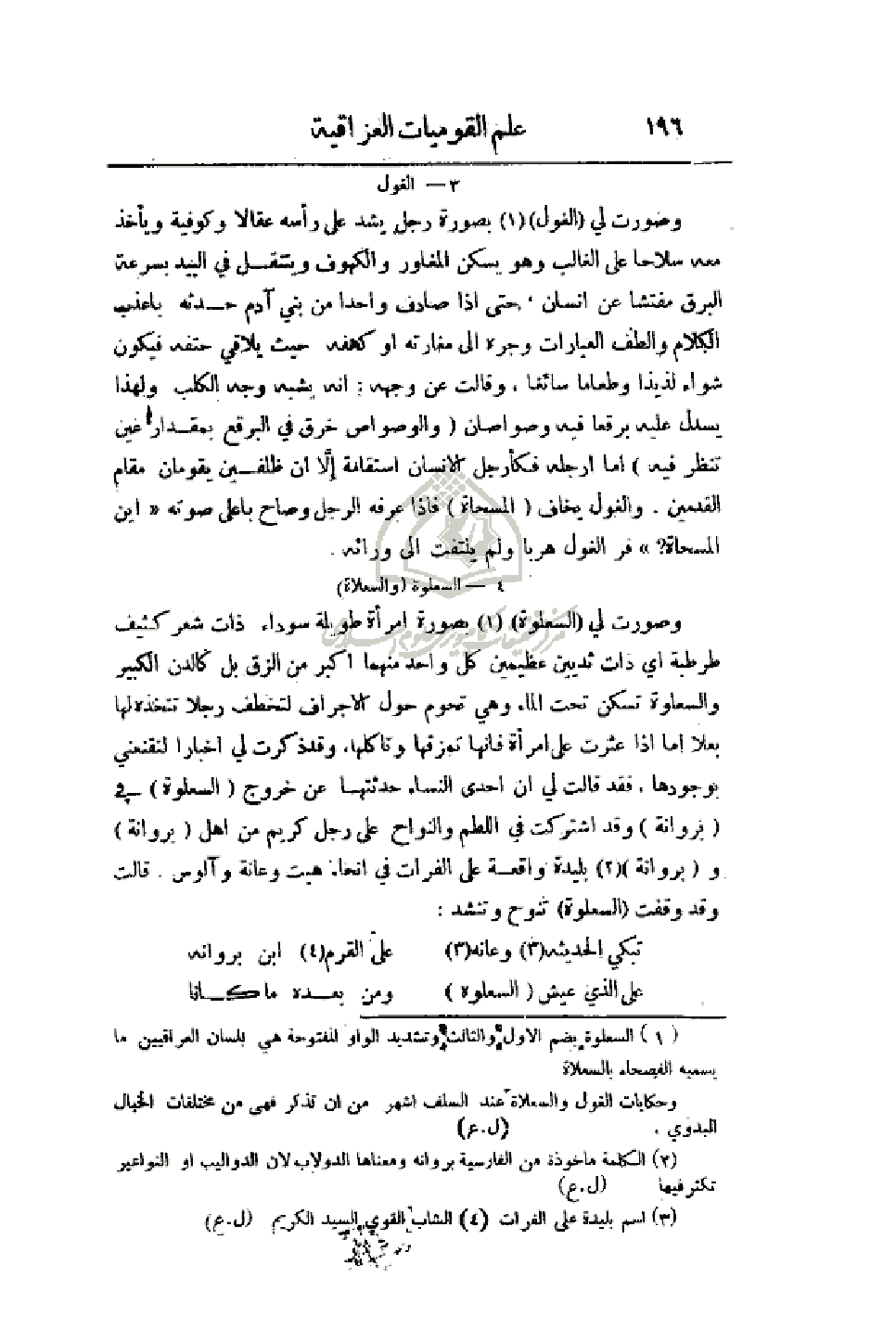 وصورت لي (السعلوة) بصورة امرأة طويلة سوداء ذات شعر كثيف طرطبة أي ذات ثديين عظيمين كل واحد منهما أكبر من الزق بل كالدن الكبير والسعلوة تسكن تحت الماء وهي تحوم حول الأجراف لتخطف رجلاً تتخذه لها بعلاً أما إذا عثرت على امرأة فأنها تمزقها وتأكلها، وقد ذكرت لي أخباراً لتقنعني بوجودها، فقد قالت لي أن إحدى النساء حدثتها عن خروج (السعلوة) في (بروانة) وقد اشتركت في اللطم والنواح على رجل كريم من أهل (بروانة) و (بروانة) بليدة واقعة على الفرات في أنحاء هيت وعانة واّلوس. قالت وقد وقفت (السعلوة) تنوح وتنشد: