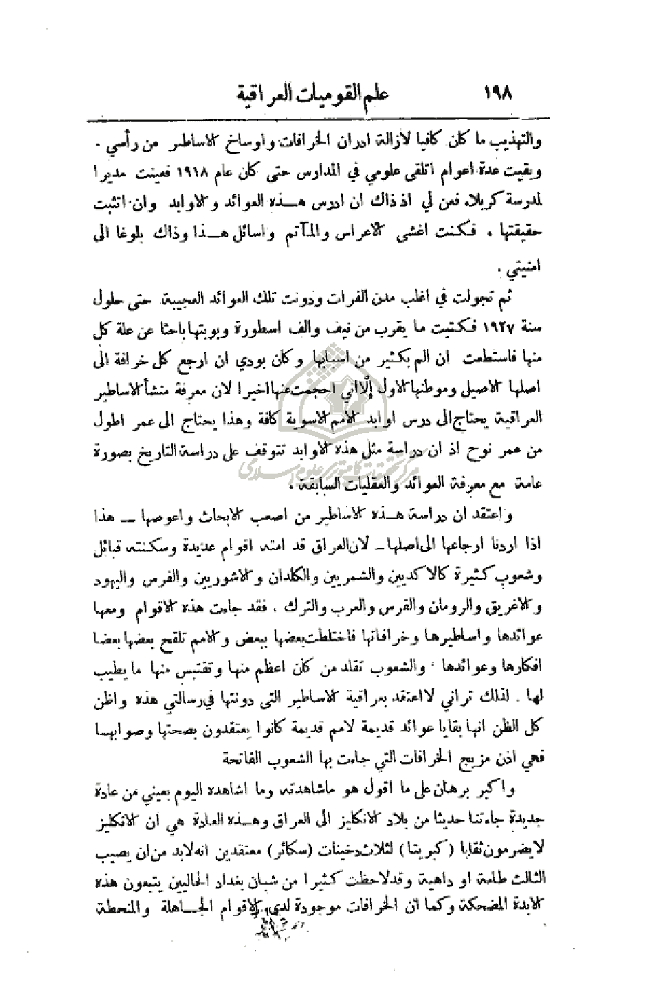 واعتقد أن دراسة هذه الأساطير من اصعب الأبحاث وأعوصها - هذا إذا أردنا إرجاعها إلى اصلها - لأن العراق قد أمته أقوام عديدة وسكنته قبائل وشعوب كثيرة كالاكديين والشمريين والكلدان والآشوريين والفرس واليهود والإغريق والرومان والفرس والعرب والترك. فقد جاءت هذه الأقوام ومعها عوائدها وأساطيرها وخرافاتها فاختلطت بعضها ببعض والأمم تلقح بعضها بعضا أفكارها وعوائدها، والشعوب تقلد من كان اعظم منها ما يطيب لها. لذلك تراني لا اعتقد بعراقية الأساطير التي دونتها في رسالتي هذه أظن كل الظن أنها بقايا عوائد قديمة لأمم قديمه كأننا يعتقدون بصحتها وصوابها فهي إذن مزيج الخرافات التي جاءت بها الشعوب الفاتحة.
