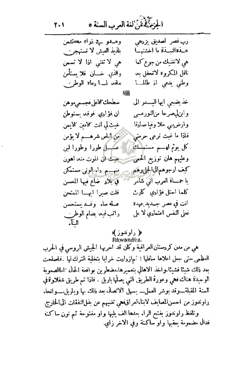 هي من مدن كردستان العراقية وكان قد أخربها الجيش الروسي في الحرب العظمى حتى جعل أعلاها سافلها: ثم ازدادت خراباً بتخليه الترك لها. فأصلحت بعد ذلك شيئاً فشيئاً، واخذ الأهالي بتعميرها مضطرين بواقعة الحال أما الصعوبة الوحيدة هناك فهي وعورة الطريق التي يصلها باربيل، فإذا تم طريق شقلاوة في السنة المقبلة - وقد بوشر العمل - يسهل الاتصال بعد ذلك بها وباربل، - وأنحاء راوندوز من احسن المصايف لأبناء العراق فهي تغنيهم عن بذل النفقات إلى الخارج.