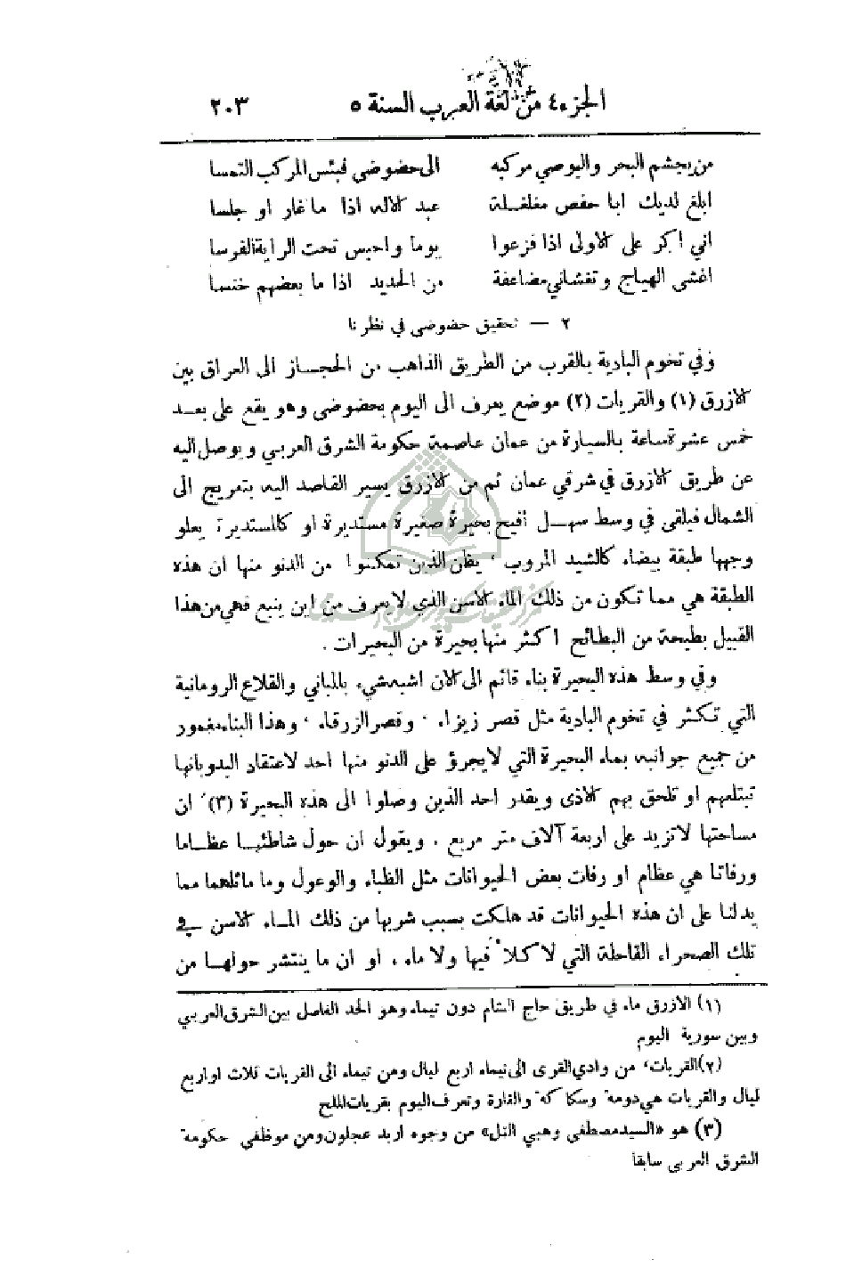 وفي تخوم البادية بالقرب من الطريق الذاهب من الحجاز إلى العراق بين الأزرق والقريات موضع يعرف إلى اليوم بحضوضي وهو يقع على بعد خمس عشرة ساعة بالسيارة من عمان عاصمة حكومة الشرق العربي ويوصل إليه عن طريق الأزرق في شرقي عمان ثم من الأزرق يسير القاصد إليه بتعريج إلى الشمال فيلقى في وسط سهل أفيح بحيرة صغيره مستديرة أو كالمستديرة يعلو وجهها طبقه بيضاء كالشيد المروب، يظن الذين تمكنوا من الدنو منها أن هذه الطبقة هي مما تكون من ذلك الماء الآسن الذي لا يعرف من أين ينبع فهي من هذا القبيل بطيحة من البطائح اكثر منها بحيرة من البحيرات.