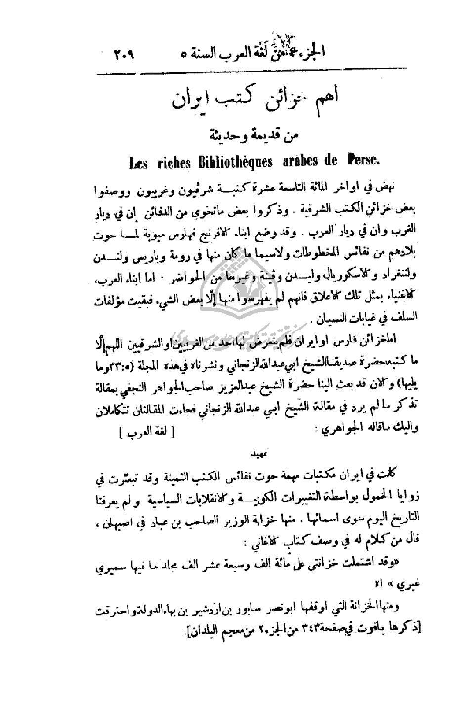 أما خزائن فارس أو إيران فلم يتعرض لها أحج من الغربيين أو الشرقيين اللهم إلا ما كتبه حضرة صديقنا الشيخ أبي عبد الله الزنجاني ونشرناه في هذه المجلة (5: 33 وما يليها) والآن قد بعث إلينا حضرة الشيخ عبد العزيز صاحب الجواهر النجفي بمقالة تذكر ما لم يرد في مقالة الشيخ أبي عبد الله الزنجاني فجاءت المقالتان تتكاملان واليك مقالة الجواهري: