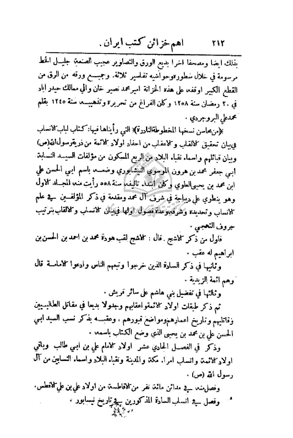 (من محاسن نسخها المخطوطة النادرة) التي رأيناها فيها: كتاب لباب الأنساب في بيان تحقيق الألقاب والإعقاب من أحفاد أولاد الأئمة من ذرية رسول الله (ص) وبيان قبائلهم وأسماء نقباء البلاد من الربع المسكون من مؤلفات السيد النسابة أبي جعفر محمد بن هارون الموسوي النيشابوري وضعه باسم أبي الحسن علي ابن محمد بن يحيى العلوي وكان ابتداء تأليفه سنة 558 رأيت منه المجلد الأول وهو ينطوي على ديباجة في شرف آل محمد ومقدمة في ذكر المؤلفين في علم الأنساب وتحديده وشرفه وعدة فصول أولها في بيان الأنساب والألقاب بترتيب حروف التهجي.