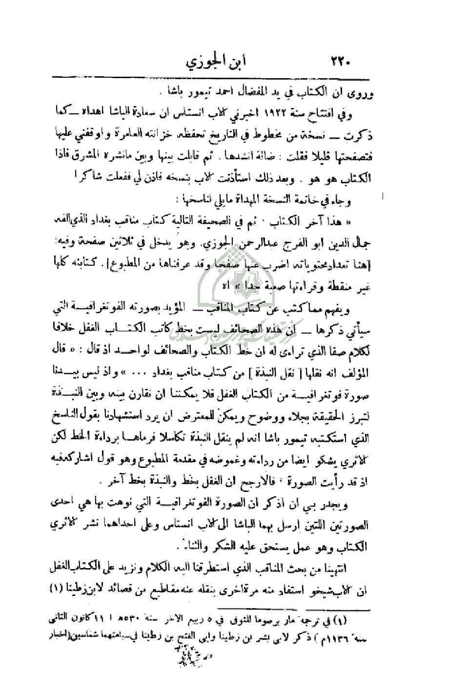 ويجدر بي أن اذكر أن الصورة الفوتوغرافية التي نوهت بها هي إحدى الصورتين اللتين أرسل بهما الباشا إلى الأب انستاس وعلى إحداهما نشر الأثري الكتاب وهو عمل يستحق عليه الشكر والثناء.