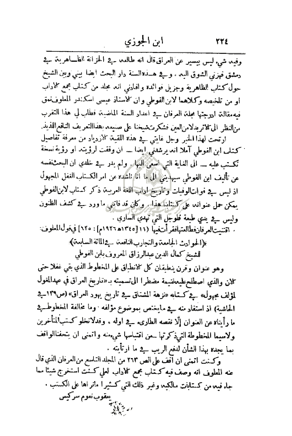 وفيه شيء ليس بيسير عن العراق قال أنه طالعه في الخزانة الظاهرية في دمشق فهزني الشوق إليه، وفي هذه السنة دار البحث أيضاً بيني وبين الشيخ حول كتاب الظاهرية وجزيل فوائده وأفادني أنه مجلد من كتاب مجمع الآداب أو من تلخيصه وكلاهما لابن الفوطي وأن الأستاذ عيسى اسكندر المعلوف نمق فيه مقالة أدرجتها مجلة العرفان في أعداد السنة الماضية فطاب لي هذا التقرب من النظر إلى الأثر بدلا من العين فشكرت شيخنا على صنيعه بهذا التعريف النافع اللذيذ.