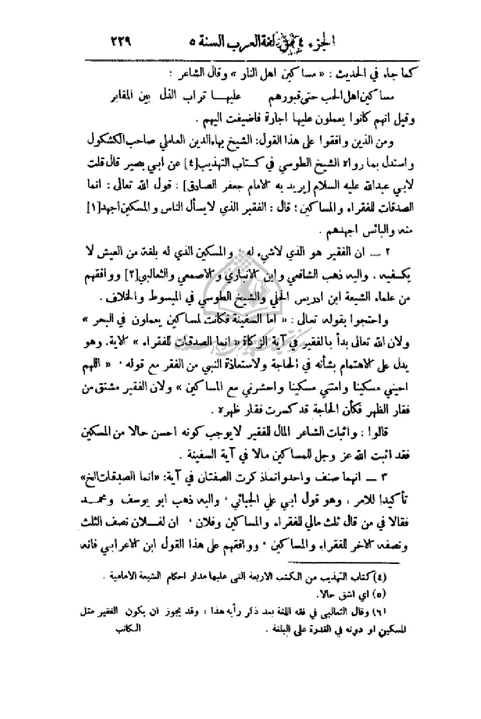 2 - أن الفقير هو الذي لاشيء له، والمسكين الذي بلغة من العيش لا يكفيه. واليه ذهب الشافعي وابن الأنباري والاصمعي والثعالبي ووافقهم من علماء الشيعة ابن إدريس الحلي والشيخ الطوسي في المبسوط والخلاف.