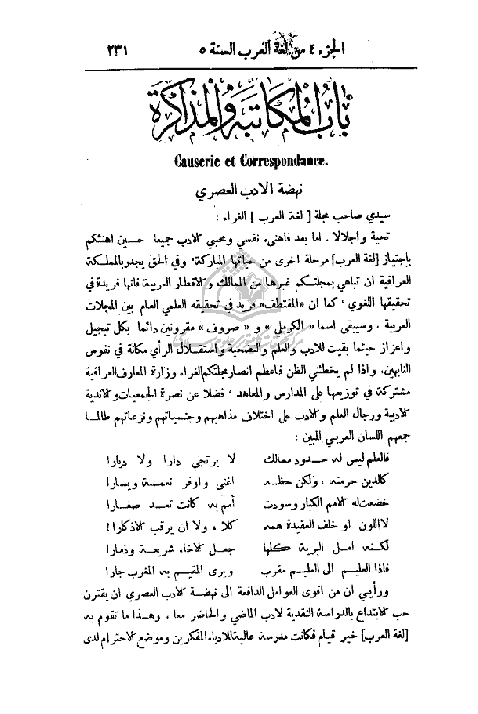 تحيةً وإجلالاً. أما بعد فأهنئ نفسي ومحبي الأدب جميعا حين أهنئكم باجتياز (لغة العرب) مرحلة أخرى من حياتها المباركة وفي الحق يجدر بالمملكة العراقية أن تباهي بمجلتكم غيرها من الممالك والأقطار العربية فأنها فريدة في تحقيقها اللغوي كما أن (المقتطف) فريد في تحقيقه العلمي العام بين المجلات العربية، وسيبقى اسما (الكرملي) و (صروف) مقرونين دائما بكل تبجيل وإعزاز حيثما بقيت للأدب والعلم والتضحية واستقلال الرأي مكانه في نفوس النابهين، وإذا لم يخطئني الظن فاعظم أنصار مجلتكم الغراء وزارة المعارف العراقية مشتركة في توزيعها على المدارس والمعاهد. فضلا عن نصرة الجمعيات والأندية الأدبية ورجال العلم والأدب على اختلاف مذاهبهم وجنسياتهم ونزعاتهم طالما جمعهم اللسان العربي المبين: