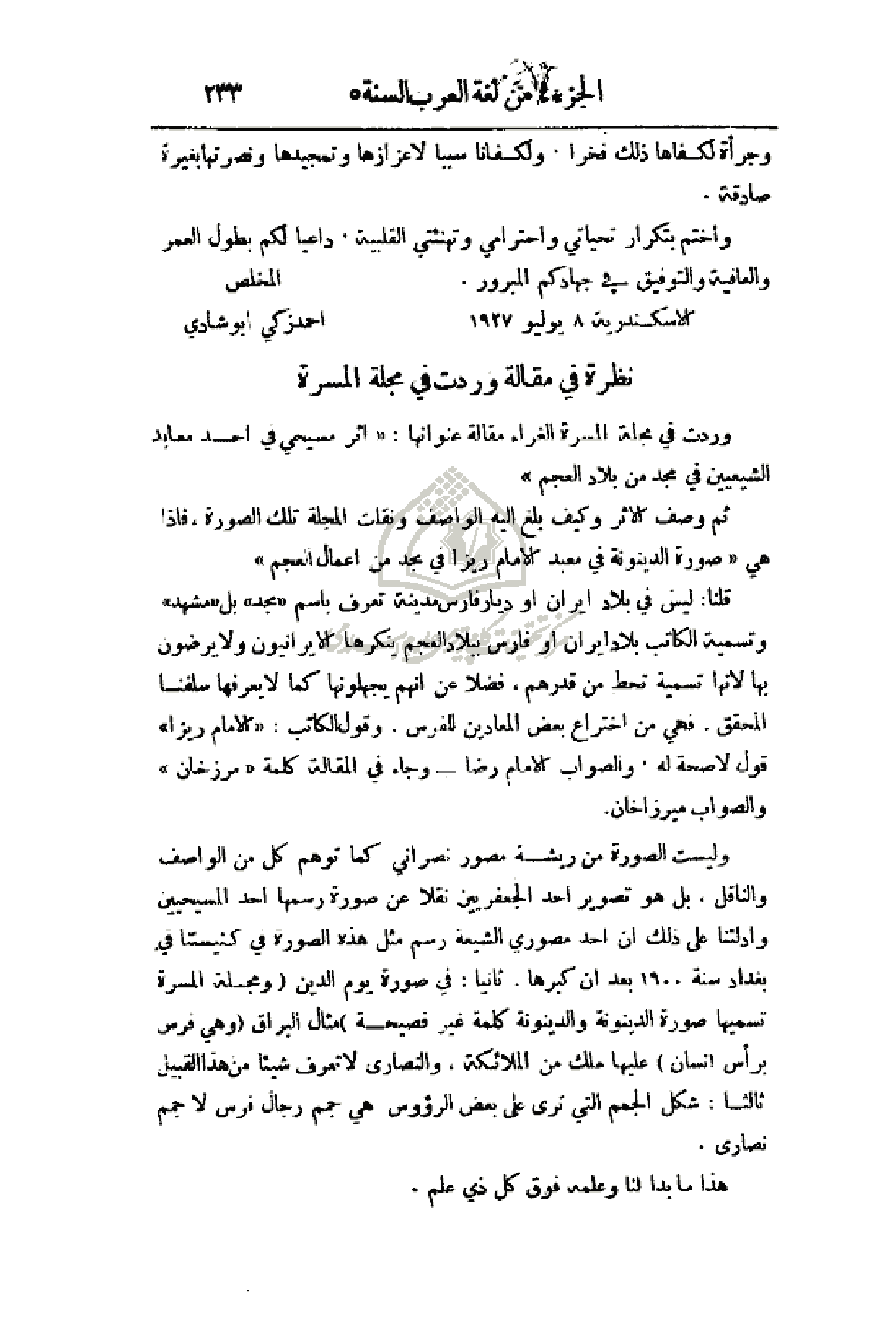 وليست الصورة من ريشة مصور نصراني كما توهم كل من الواصف والناقل، بل هو تصوير أحد الجعفريين نقلاً عن صورة رسمها أحد المسيحيين وأدلتنا على ذلك أن أحد مصوري الشيعة رسم مثل هذه الصورة في كنيستنا في بغداد سنة 1900 بعد أن كبرها. ثانياً. في صورة يوم الدين (ومجلة المسرة تسميها صورة الدينونة والدينونة كلمة غير فصيحة) مثال البراق (وهي فرس برأس إنسان) عليها ملك من الملائكة، والنصارى لا تعرف شيئاً من هذا القبيل ثالثاً: شكل الجمم التي تر على بعض الرؤوس هي جمم رجال فرس لا جمم نصارى
