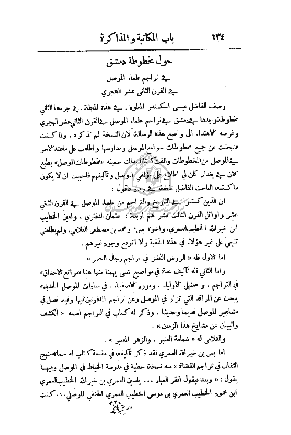 وصف الفاضل عيسى أسكندر المعلوف في هذه المجلة في جزئها الثاني مخطوطة وجدها في دمشق في تراجم علماء الموصل في القرن الثاني عشر الهجري وغرضه الاهتداء إلى واضع هذه الرسالة لأن النسخة لم تذكره. ولما كنت قد بحثت عن جميع مخطوطات جوامع الموصل ومدارسها واطلعت على ما عند الأسر في الموصل من المخطوطات والفت كتاباً بذلك سميته (مخطوطات الموصل) يطبع الآن في بغداد كان لي اطلاع على مؤلفي الموصل وتأليفهم فأحببت أن لا يكون ما كتبه الباحث الفاضل نفخة في رماد فأقول: