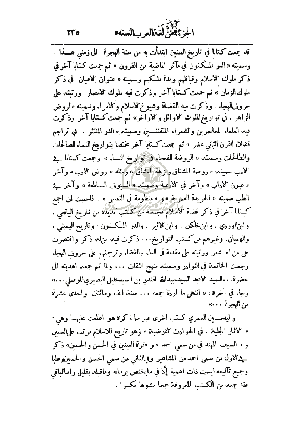 قد جمعت كتابا في تاريخ السنين ابتدأت به من سنة الهجرة إلى زمني هذا، وسميته (الدر المكنون في مآثر الماضية من القرون) ثم جمعت كتاباً آخر في ذكر ملوك الإسلام وقبائلهم ومدة ملكهم وسميته (عنوان الأعيان في ذكر ملوك الزمان) ثم جمعت كتاباً آخر وذكرت فيه ملوك الأمصار ورتبته