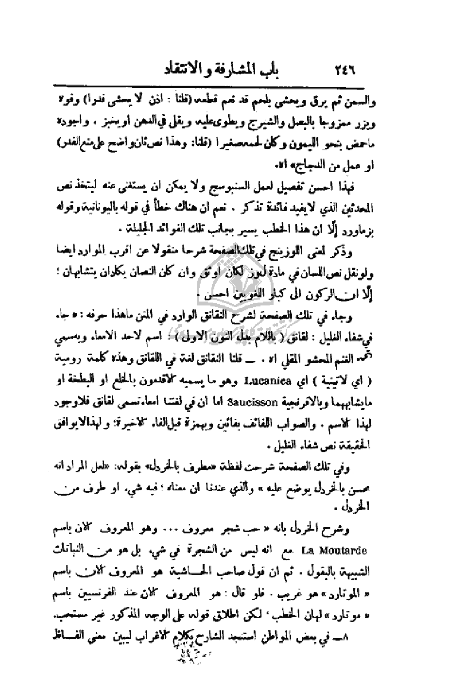 وجاء في تلك الصفحة لشرح النقانق الواردة في المتن ما هذا حرفه (جاء في شفاه الغليل: لقانق (باللام بدل النون الأولى): اسم لأحد الأمعاء وبه سمي معي الغنم المحشو المقلي اهـ - قلنا النقانق لغة في اللقانق وهذه كلمة رومية (أي لاتينية) أي وهو ما يسميه الأقدمون بالخلع أو البطخة أو ما يشابههما وبالإفرنجية أما أن في لغتنا أمعاء تسمى لقانق فلا وجود لهذا الاسم. والصواب اللفائف بفاءين وبهمزة قبل الفاء الأخيرة؛ ولهذا لا يوافق الحقيقة نص شفاء الغليل.