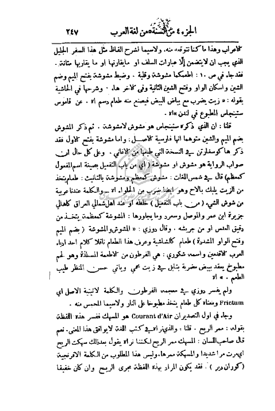 قلنا: أن الذي ذكره ستينجاس هو مشوش لا مشوشة. ثم ذكر المشوش بضم الشين والميم متوهما أنها فارسية الأصل. وأما مشوشة بفتح الأول فقد ذكرها كوسغارتن في النسخة التي طبعها من الأغاني. وعلى كل حال أن صواب الرواية هو مشوش أو مشمشة (أي من باب التفعيل بصيغة اسم المفعول كمعظم) قال في شمس اللغات: مشوش كمعظم ومشوشة بالتأنيث طعام يتخذ من الزيت يلبك بالاح وهو أيضاً ضرب من الحلواء اهـ - والكلمة عندنا عربية من شوش الشيء (من باب التفعيل) خلطه أو عند أهل شمالي العراق كأهالي جزيرة ابن عمر والموصل وسعرد وما يجاورها: المشوشة كمعظمة يتخذ من دقيق العدس أو من جريشه وقال دوزي (المشوش والمشوشة (بضم الميم وفتح الواو المشددة) طعام كالشاشية وعرف هذا الطعام ناقلا كلام أحد أدباء العرب الأقدمين واسمه شكوري: هي الفرطون من الأطعمة المستلذة وهو لحم مطبوخ يعقد ببيض مضربة بتابل في زيت محمي ويأتي حسن المنظر طيب الطعم) اهـ