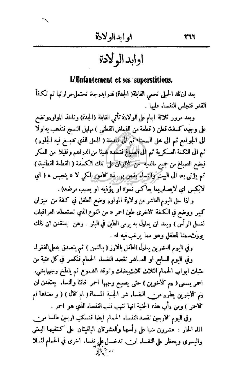 وبعد مرور ثلاثة أيام على الولادة تأتي القابلة (الجدة) وتأخذ المولود وتضع على وجهه كسفة قطن (قطعة من القماش القطني) مهلهل النسج فتذهب به أولا إلى الجوامع ثم إلى محل السجناء ثم إلى المدبغة (المحل الذي تدبغ فيه الجلود) ثم إلى الثكنة العسكرية ثم إلى الصباغ فتنقده شيئا من الدراهم وقليلا من السكر فيضع الصباغ من جميع ما لديه من الألوان على تلك الكسفة (القطعة القطنية) ثم يؤتى به إلى البيت والنساء يقمن بهذه الأمور لكي لا (ينجبس) (أي لا يكبس أي لا يصاب بما يعاكس نموه أو يؤذيه أو يسبب مرضه).