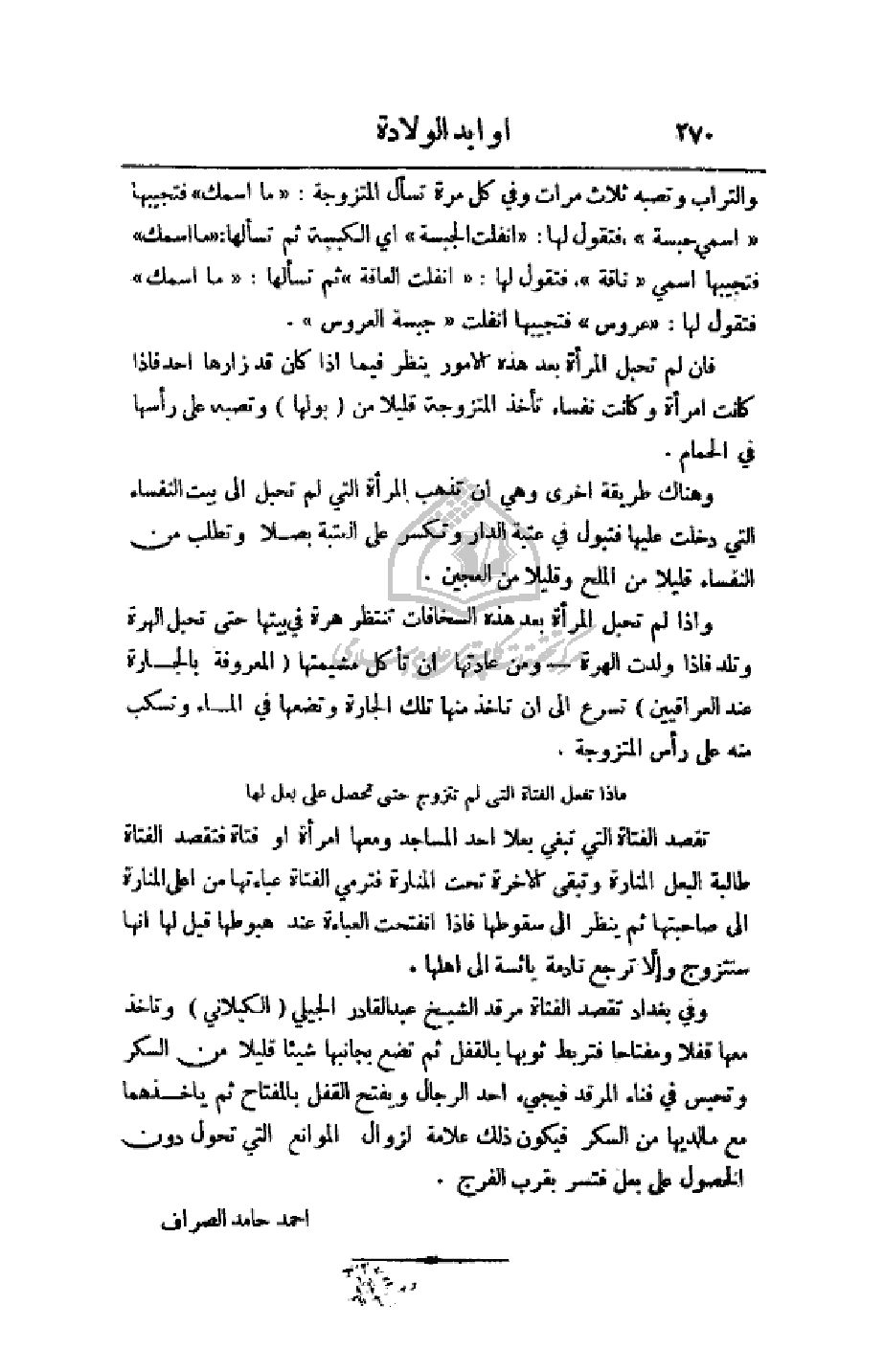 وفي بغداد تقصد الفتاة مرقد الشيخ عبد القادر الجيلي (الكيلاني) وتأخذ معها قفلا ومفتاحا فتربط ثوبها بالقفل ثم تضع بجانبها شيئا قليلا من السكر وتحبس في فناء المرقد فيجيء أحد الرجال ويفتح القفل بالمفتاح ثم يأخذهما مع ما لديها من السكر فيكون ذلك علامة لزوال الموانع التي تحول دون الحصول على بعل فتسر بقرب الفرج.