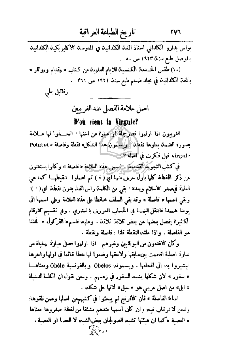 أما (الفاصلة) فإن الإفرنج لم يبحثوا في كتبهم عن أصلها وعمن تلقوها: ونحن لا نرتاب فيه وإن كان اسمها عندهم مشتقا من لفظة صغروها معناها (العصية) كما أن هيئتها تشبه الصولجان بعض الشبه لا العصا أو العصية.