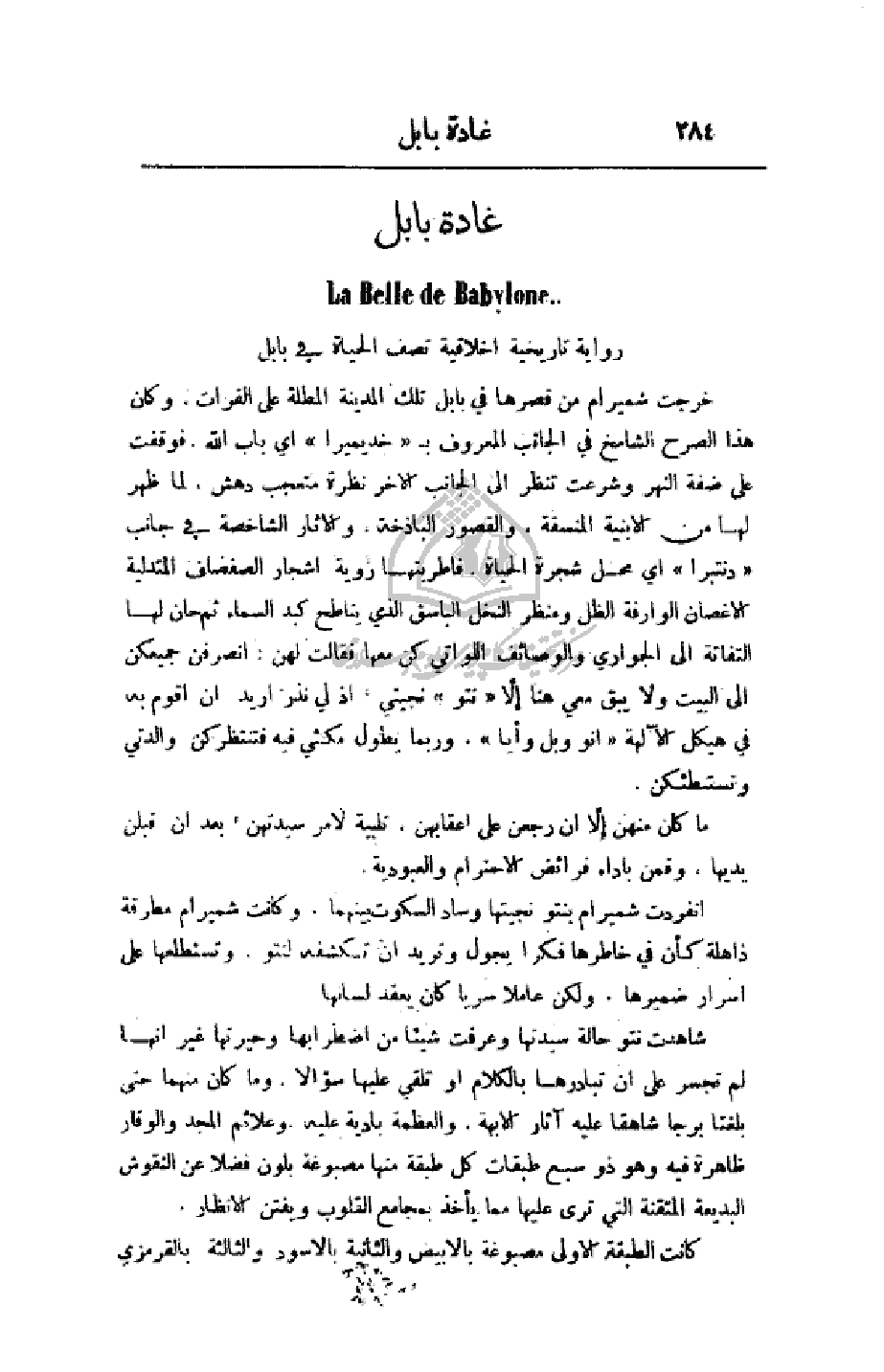 خرجت شميرام من قصرها في بابل تلك المدينة المطلة على الفرات. وكان هذا الصرح الشامخ في الجانب المعروف ب (خديميرا) أي باب الله. فوقفت على ضفة النهر وشرعت تنظر إلى الجانب الآخر نظرة متعجب دهش، لما ظهر لها من الأبنية المنسقة، والقصور الباذخة. والآثار الشاخصة في جانب (دنتبرا) أي محل شجرة الحياة. فأطربتها روية أشجار الصفصاف المتدلية الأغصان الوارفة الظل ومنظر النخل الباسق الذي ينطح كبد السماء ثم حان لها التفاتة إلى الجواري والوصائف اللواتي كن معها فقالت لهن: انصرفن جميعكن إلى البيت ولا يبق معي هنا إلا (نتو) نجيتي. إذ لي نذر أريد أن أقوم به في هيكل الآلهة (أنو وبل وأيا). وربما يطول مكثي فيه فتنتظركن والدتي وتستبطئكن.