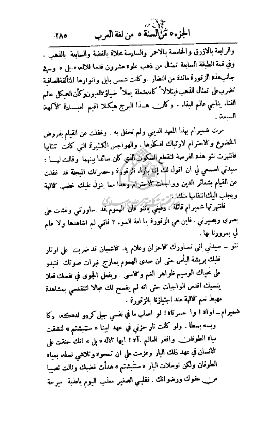فانتهرتها شميرام قائلة: دعيني يا نتو فإن الهموم قد ساورتني وغشت على بصري وبصيرتي. فأين هي الزقورة يا أمة السوء؟ فإنني لم أشاهدها ولا علم لي بمرورنا بها.