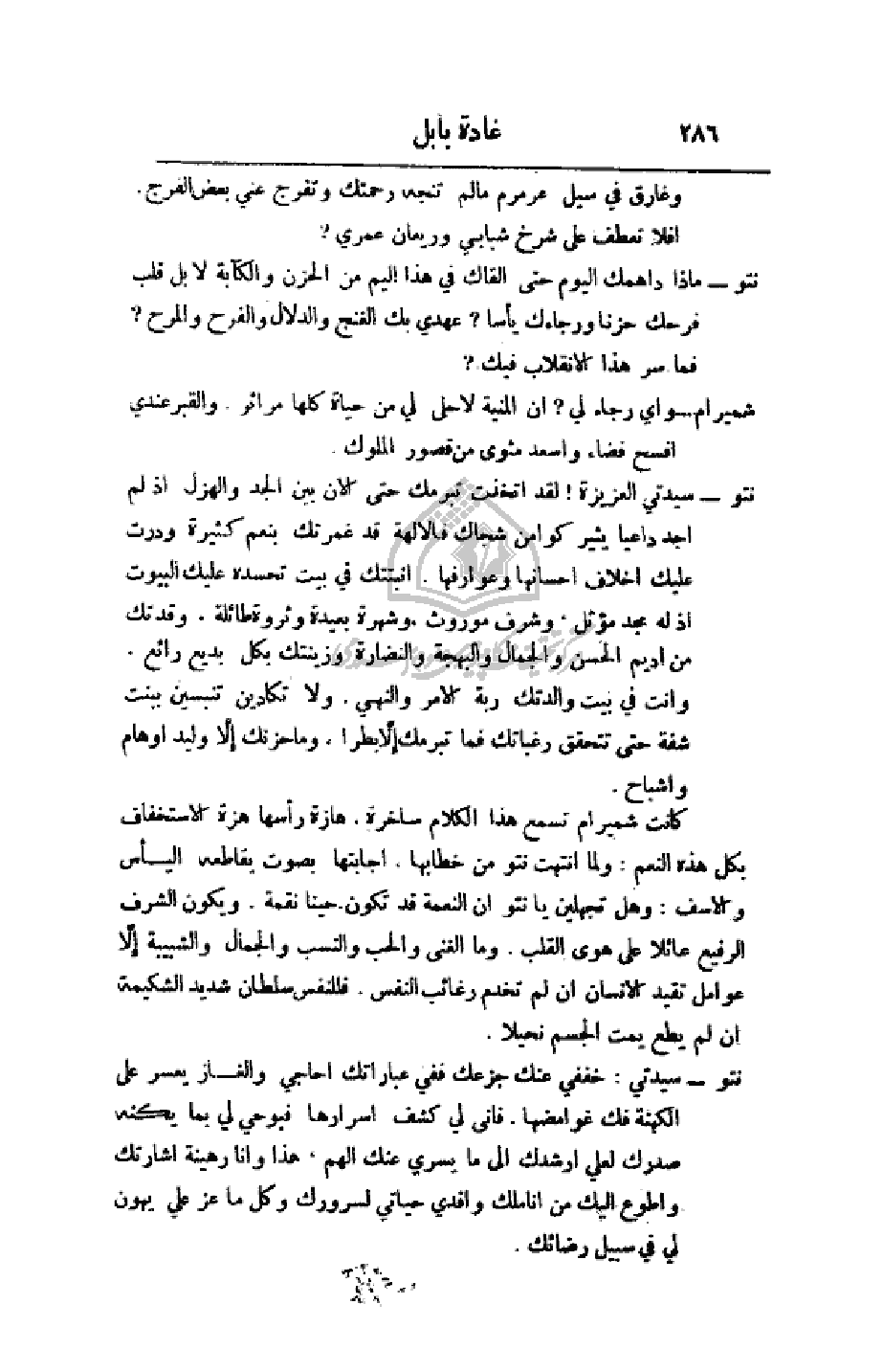 كانت شميرام تسمع هذا الكلام ساخرة. هازة رأسها هزة الاستخفاف بكل هذه النعم: ولما انتهت نتو من خطابها، أجابتها بصوت يقاطعه اليأس والأسف: وهل تجهلين يا نتو أن النعمة قد تكون حينا نقمة. ويكون الشرف الرفيع عائلا على هوى القلب. وما الغنى والحب والنسب والجمال والشبيبة إلا عوامل تقيد الإنسان إن لم تخدم رغائب النفس. فللنفس سلطان شديد الشكيمة إن لم يطع يمت الجسم نحيلا.